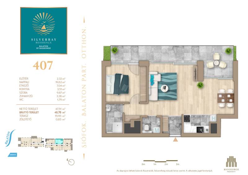 Projekt bemutatásaPEZSGÉS ÉS NYUGALOMEgyesíti mindazokat az előnyöket, amelyek oly vonzóvá teszik a Balaton fővárosát: a pezsgés és a nyugalom egyszerre található meg, ráadásul a számtalan kikapcsolódási lehetőség mellett egyre több fine dining étterem is fellelhető ebben a térségben.A PROJEKTRŐLA Silverbay Residenceben 69 egyedi elrendezésű lakást kínálunk, 32-145 m2 közötti méretekben, a leginnovatívabb építészeti megoldásokkal, kültéri medencével és minőségi anyaghasználattal. Minden lakáshoz tágas terasz tartozik, parkolás az arra a célra kialakított mélygarázsban és felszíni parkolókban biztosított. Minden lakószint megközelítését lift biztosítja a teremgarázsból.Az épület közvetlen környezetében számtalan kikapcsolódási lehetőséget találunk, a város zajától mégis távol. Minden lakáshoz erkély tartozik, a földszinten privát kertek, a legfelső emeleten panorámás tetőteraszok emelik az otthonok értékét. A kertben kültéri medence is kialakításra kerül, így biztosítva a változatos vízparti időtöltést.LOKÁCIÓ:A Silverbay Residence Siófokon a Deák Ferenc sétányon, közvetlenül vízparti elhelyezkedéssel kínál 69 egyedi elrendezésű lakást. Siófok a déli part központja. A Budapesttől 1 órányi autótávolságra fekvő város változatos kikapcsolódási lehetőségeket rejt.Az épület teljesíti a 7/2006. TNM rendelet közel nulla energiaigényű épületre vonatkozó követelményeit.