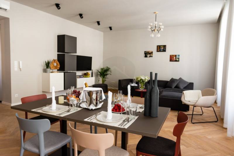 MEGÉRKEZETT!! ELHOZTAM!!!! Engedje meg, hogy figyelmébe ajánljam ezt a páratlan, luxuskategóriás penthouse lakást Budapest V. kerületének egyik legelőkelőbb utcájában, a Hercegprímás utcában. Ez az impozáns, 105 négyzetméteres ingatlan a belvárosi elegancia és modern kényelem tökéletes harmóniáját nyújtja, amely kiváló befektetési lehetőséget kínál az igényes vásárlók számára.A lakás frissen felújított, három tágas szobával és két luxus kivitelű fürdőszobával rendelkezik. Az amerikai konyhás nappali tágas, világos tereivel és prémium anyagokból készült, egyedi tervezésű beépített bútorokkal biztosítja a legmagasabb szintű komfortot. A lakás légkondicionált, fűtési rendszere pedig modern gázcirkó, egyedi mérési lehetőségekkel, amely garantálja a kellemes hőmérsékletet az év bármely szakában.A lakás központi elhelyezkedésének köszönhetően kiváló közlekedési lehetőségekkel rendelkezik, így Budapest bármely pontja könnyedén elérhető. Az elegáns környék számos üzlettel, étteremmel és kávézóval várja az itt lakókat, miközben a csendes utcák nyugalma ideális otthoni környezetet biztosít. A környék turisztikai népszerűsége miatt ez az ingatlan rendkívül keresett a bérbeadási piacon, biztos jövedelemforrást jelentve a tulajdonosnak.Ez az ingatlan nemcsak egy stílusos és kényelmes otthon, hanem egy kiváló befektetési lehetőség is, amely hosszú távon garantálja a magas hozamokat. Amennyiben bármilyen kérdése merülne fel, kérem, forduljon hozzám bizalommal! Szívesen nyújtok további információkat és segítek az ingatlanvásárlás teljes folyamatában.