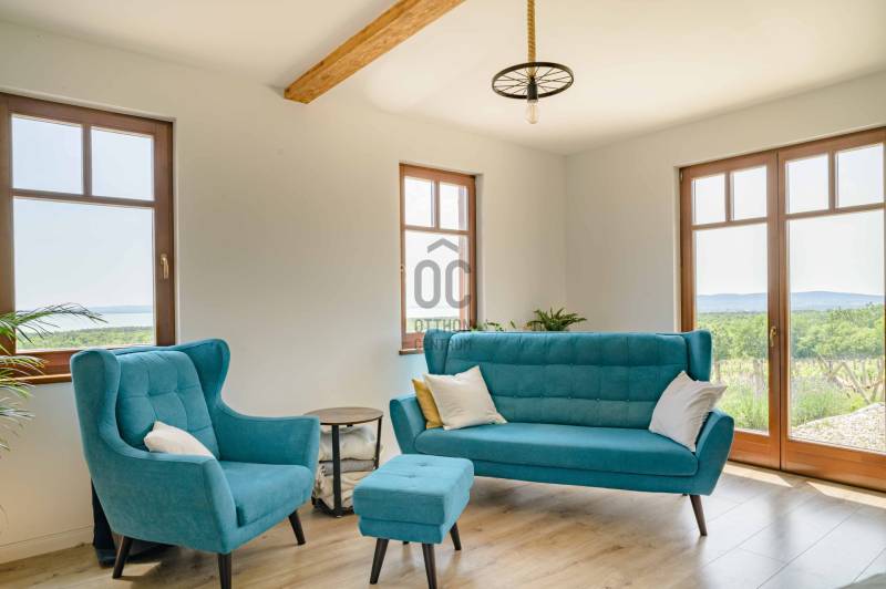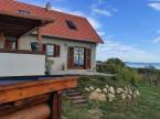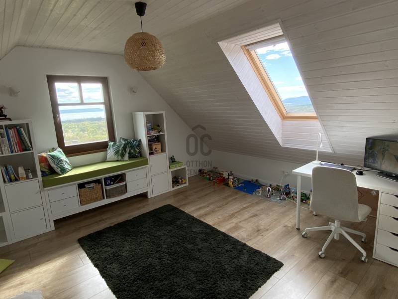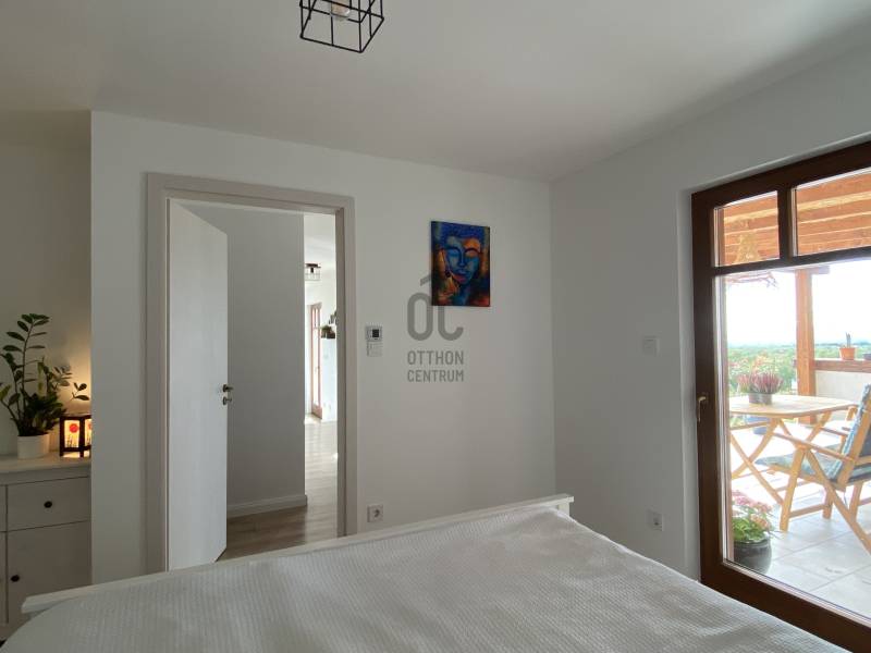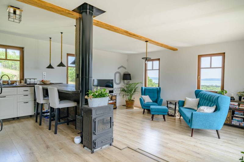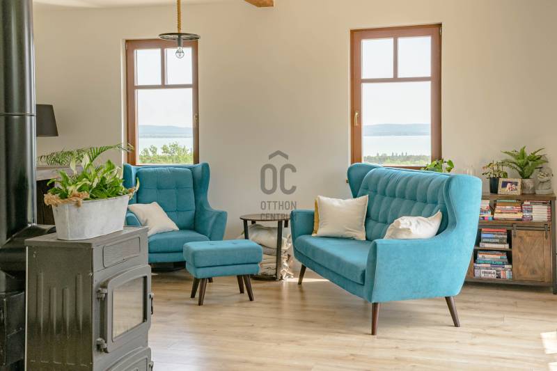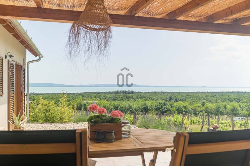 A 2021-ben épült, újszerű állapotban lévő ingatlan egy 3857m2-es bekerített kis szőlőbirtokon fekszik, amely minden pontjáról egyedülálló, elvehetetlen panorámát kínál a Balatonra, a zánkai öbölre és a Hegyestűre.A 3 szintes, 220m2-es alapterületű épület az amerikai konyhás nappali mellett 5 külön bejáratú (3 kertkapcsolatos) hálószobával rendelkezik, melyek mindegyikéhez saját fürdőszoba tartozik.Szintén helyet kapott egy konyhával felszerelt autentikus borozó, egy 24m2-es fedett, egy 24m2-es nyitott valamint 2 kisebb terasz, illetve egy lenyűgöző, balatoni panorámás kültéri rönk szaunaház, hozzá tartozó vizesblokkal és pihenő helyiséggel.Az ingatlan az elmúlt 3 évben minősített, bejáratott vendégházként üzemelt (szezonban teljes telt házzal), így a fenti irányáron vállalkozásként is remek lehetőséget és komoly bevételi potenciált foglal magában. Az egyedi tervezésnek köszönhetően akár 4 teljesen külön bejáratú apartman is kiadható, miközben a családi lakrész privát szférája is megmarad. Mivel a zárt lépcsőháznak köszönhetően a három szint egyben, vagy külön-külön is használható, így akár többgenerációs otthonként is hasznosítható.A ház délnyugati tájolásának köszönhetően minden napszakban rendkívül világos. Külső megjelenésében a Balaton-felvidéki vakolatdíszes présházak stílusjegyeit követi, melyet a 3 rétegű fa nyílászárók és zsalugáterek, valamint a nappaliban található hangulatos kályha tesznek teljessé. A belteret magas minőségű burkolatok, valamint rusztikus, egyedi gyártású öregfa bútorok jellemzi.A téli-nyári komfortról hőszivattyú, valamint energiatudatos NGBS épületgépészeti rendszer gondoskodik, iCON smart applikációról vezérelhető mennyezethűtés-padlófűtés szabályozó megoldással. Egy szintén applikációról vezérelhető Bosch riasztórendszer is kiépítésre került. Közművek közül 3X20A villany található, a vízellátást kiváló minőségű és vízhozamú fúrt kút biztosítja, egy 1000 literes puffer és egy 500 literes melegvíz tartállyal kiegészítve.Az erdő szélén található terület a béke szigete, ahol leendő tulajdonosa teljes csendben élvezheti a természet kézzel fogható közelségét és a Balaton varázslatos panorámáját. A hely különlegességét az adja, hogy kizárólag a környező erdőkre lehet rálátni, miközben mégis a falu felett helyezkedik el, és a csodálatos Balatonakali strand is mindössze 2km-re található. A telek egy végig betonos valamint egy jó minőségű szórt köves úton is kiválóan megközelíthető.A környék a Káli medence kapujaként számtalan gyönyörű természeti kincset és kirándulási lehetőséget kínál, a ház mögötti erdőben csodálatos túraútvonal indul a dörgicsei templomromhoz és levendáriumhoz. A közelben egész évben nyitva tartó nagyszerű éttermek és borászatok találhatók, autóval pedig Tihany és Balatonfüred is 20 perc alatt elérhető.A külterületi telek jelenleg szőlőművelési ágban van, így kifüggesztéses eljárással vásárolható meg.For Sale by Owner: 5-Bedroom Family and Apartment House with Scenic Views in Fenyehegy, Balatonakali This property, built in 2021 and in like-new condition, is situated on a 3857m² enclosed small vineyard, offering unique, unobstructed views of Lake Balaton, the Zánka Bay, and Hegyestű from every point. The 3-storey building, with a usable area of 220m², features an open-plan kitchen and living room, 5 separate entrance bedrooms (3 with garden access), each with its own bathroom. There is also an authentic wine cellar equipped with a kitchen, a 24m² covered terrace, a 24m² open terrace, two smaller terraces, and an impressive outdoor log sauna house with a panoramic view of Lake Balaton, complete with a water block and relaxation room. The property has operated as a certified, well-established guesthouse for the past 3 years (fully booked during the season), making it an excellent business opportunity with significant income potential at the listed price. Thanks to its unique design, up to 4 completely separate apartments can be rented out while maintaining the privacy of the family living area. The three levels can be used together or separately due to the enclosed staircase, making it suitable for multi-generational living. Thanks to its southwest orientation, the house is extremely bright at all times of the day. The exterior follows the style of plastered press houses of the Balaton Highlands, completed by triple-glazed wooden windows and shutters, and a cozy stove in the living room. The interior features high-quality finishes and rustic, custom-made old wood furniture, which are included in the purchase price. Comfort is ensured year-round by a heat pump and an energy-conscious NGBS building engineering system, with ceiling cooling and underfloor heating controlled by the iCON smart application. A Bosch alarm system, also controllable via an app, has been installed. Utilities include 3X20A electricity, and water supply is provided by a high-quality, high-yield drilled well, supplemented by a 1000-liter buffer and a 500-liter hot water tank.Located at the edge of the forest, the area is a peaceful haven where the future owner can enjoy the tangible proximity of nature and the magical panorama of Lake Balaton in complete silence. The uniqueness of the location is that it overlooks only the surrounding forests while still being situated above the village, with the beautiful Balatonakali beach just 2km away. The plot is easily accessible via a fully paved road and a high-quality gravel road. The area, as the gateway to the Káli Basin, offers numerous beautiful natural treasures and hiking opportunities. A wonderful hiking trail starts in the forest behind the house, leading to the Dörgicse church ruins and lavender fields.