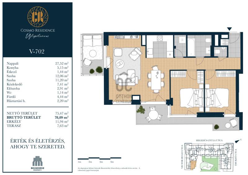 Projekt bemutatásaBudapest egyik legvonzóbb és legkeresettebb városrészében, Újlipótváros szívében egy új, exkluzív lakópark épül: az Cosmo Residence. A Hegedűs Gyula, Visegrádi, Victor Hugo és Thurzó utcák által körülhatárolt területen elhelyezkedő ingatlanfejlesztés a városrész ikonikus, nagypolgári hangulatát ötvözi, modern életstílussal, magas színvonalú építészeti megoldásokkal és első osztályú kényelemmel.A Cosmo Residence nemcsak egy újabb lakópark – hanem egy életstílus, amely a belvárosi pezsgést és a nyugodt, zöld környezetet egyaránt biztosítja lakóinak. Az ingatlan 2027. első felére készül el, és összesen 230 változatos méretű és elrendezésű lakást kínál, a 32 m2-es stúdiólakásoktól kezdve egészen a tágas, 125 m2-es, nappali + három hálószobás lakásokig. A legtöbb lakás erkéllyel rendelkezik, a legfelső szinten pedig exkluzív penthouse lakások várják azokat, akik a privát tetőterasz nyújtotta különleges panorámát szeretnék élvezni.A lakások tervezésekor több mint 4000 vevői visszajelzést vettünk figyelembe, így a terek és elrendezések maximálisan alkalmazkodnak a mai modern élet igényeihez. A belső kialakítások során lehetőség van egyedi igények figyelembevételére is, amit belsőépítészeti kollekciók segítenek. A 8 szintes épületben változatos méretű üzlethelyiségek is kialakításra kerülnek, melyek a földszinten kapnak helyet, további kényelmet biztosítva a lakók számára.A Biggeorge Property legújabb fejlesztése, a Cosmo Residence Budapest 13. kerületének közkedvelt helyszínén, Újlipótváros szívében épül, a Hegedűs Gyula, Visegrádi, Victor Hugo és Thurzó utca által határolt területen. A környék hangulatát tükröző épület 230 energiahatékony otthont kínál, amelyek megfelelnek a legújabb környezettudatos elvárásoknak. A fejlesztés részeként üzletek, tárolók és gépkocsi-beállók is kialakításra kerülnek, amelyek tovább növelik az épület lakóinak kényelmét.
