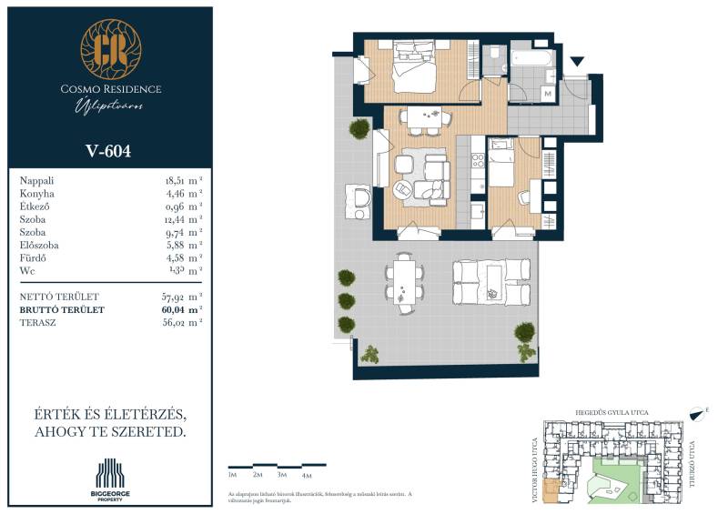 Projekt bemutatásaBudapest egyik legvonzóbb és legkeresettebb városrészében, Újlipótváros szívében egy új, exkluzív lakópark épül: az Cosmo Residence. A Hegedűs Gyula, Visegrádi, Victor Hugo és Thurzó utcák által körülhatárolt területen elhelyezkedő ingatlanfejlesztés a városrész ikonikus, nagypolgári hangulatát ötvözi, modern életstílussal, magas színvonalú építészeti megoldásokkal és első osztályú kényelemmel.A Cosmo Residence nemcsak egy újabb lakópark – hanem egy életstílus, amely a belvárosi pezsgést és a nyugodt, zöld környezetet egyaránt biztosítja lakóinak. Az ingatlan 2027. első felére készül el, és összesen 230 változatos méretű és elrendezésű lakást kínál, a 32 m2-es stúdiólakásoktól kezdve egészen a tágas, 125 m2-es, nappali + három hálószobás lakásokig. A legtöbb lakás erkéllyel rendelkezik, a legfelső szinten pedig exkluzív penthouse lakások várják azokat, akik a privát tetőterasz nyújtotta különleges panorámát szeretnék élvezni.A lakások tervezésekor több mint 4000 vevői visszajelzést vettünk figyelembe, így a terek és elrendezések maximálisan alkalmazkodnak a mai modern élet igényeihez. A belső kialakítások során lehetőség van egyedi igények figyelembevételére is, amit belsőépítészeti kollekciók segítenek. A 8 szintes épületben változatos méretű üzlethelyiségek is kialakításra kerülnek, melyek a földszinten kapnak helyet, további kényelmet biztosítva a lakók számára.A Biggeorge Property legújabb fejlesztése, a Cosmo Residence Budapest 13. kerületének közkedvelt helyszínén, Újlipótváros szívében épül, a Hegedűs Gyula, Visegrádi, Victor Hugo és Thurzó utca által határolt területen. A környék hangulatát tükröző épület 230 energiahatékony otthont kínál, amelyek megfelelnek a legújabb környezettudatos elvárásoknak. A fejlesztés részeként üzletek, tárolók és gépkocsi-beállók is kialakításra kerülnek, amelyek tovább növelik az épület lakóinak kényelmét.