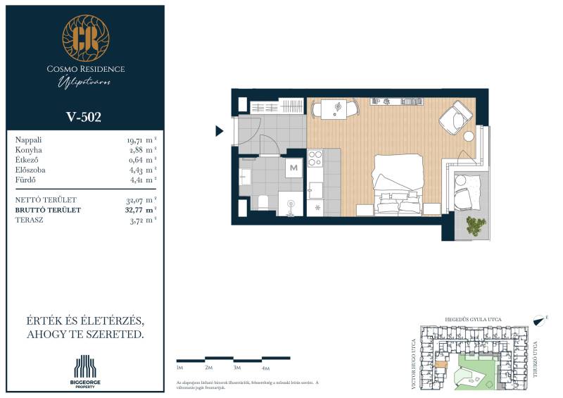 Projekt bemutatásaBudapest egyik legvonzóbb és legkeresettebb városrészében, Újlipótváros szívében egy új, exkluzív lakópark épül: az Cosmo Residence. A Hegedűs Gyula, Visegrádi, Victor Hugo és Thurzó utcák által körülhatárolt területen elhelyezkedő ingatlanfejlesztés a városrész ikonikus, nagypolgári hangulatát ötvözi, modern életstílussal, magas színvonalú építészeti megoldásokkal és első osztályú kényelemmel.A Cosmo Residence nemcsak egy újabb lakópark – hanem egy életstílus, amely a belvárosi pezsgést és a nyugodt, zöld környezetet egyaránt biztosítja lakóinak. Az ingatlan 2027. első felére készül el, és összesen 230 változatos méretű és elrendezésű lakást kínál, a 32 m2-es stúdiólakásoktól kezdve egészen a tágas, 125 m2-es, nappali + három hálószobás lakásokig. A legtöbb lakás erkéllyel rendelkezik, a legfelső szinten pedig exkluzív penthouse lakások várják azokat, akik a privát tetőterasz nyújtotta különleges panorámát szeretnék élvezni.A lakások tervezésekor több mint 4000 vevői visszajelzést vettünk figyelembe, így a terek és elrendezések maximálisan alkalmazkodnak a mai modern élet igényeihez. A belső kialakítások során lehetőség van egyedi igények figyelembevételére is, amit belsőépítészeti kollekciók segítenek. A 8 szintes épületben változatos méretű üzlethelyiségek is kialakításra kerülnek, melyek a földszinten kapnak helyet, további kényelmet biztosítva a lakók számára.A Biggeorge Property legújabb fejlesztése, a Cosmo Residence Budapest 13. kerületének közkedvelt helyszínén, Újlipótváros szívében épül, a Hegedűs Gyula, Visegrádi, Victor Hugo és Thurzó utca által határolt területen. A környék hangulatát tükröző épület 230 energiahatékony otthont kínál, amelyek megfelelnek a legújabb környezettudatos elvárásoknak. A fejlesztés részeként üzletek, tárolók és gépkocsi-beállók is kialakításra kerülnek, amelyek tovább növelik az épület lakóinak kényelmét.