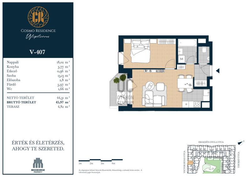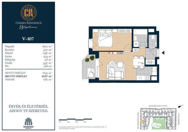 Projekt bemutatásaBudapest egyik legvonzóbb és legkeresettebb városrészében, Újlipótváros szívében egy új, exkluzív lakópark épül: az Cosmo Residence. A Hegedűs Gyula, Visegrádi, Victor Hugo és Thurzó utcák által körülhatárolt területen elhelyezkedő ingatlanfejlesztés a városrész ikonikus, nagypolgári hangulatát ötvözi, modern életstílussal, magas színvonalú építészeti megoldásokkal és első osztályú kényelemmel.A Cosmo Residence nemcsak egy újabb lakópark – hanem egy életstílus, amely a belvárosi pezsgést és a nyugodt, zöld környezetet egyaránt biztosítja lakóinak. Az ingatlan 2027. első felére készül el, és összesen 230 változatos méretű és elrendezésű lakást kínál, a 32 m2-es stúdiólakásoktól kezdve egészen a tágas, 125 m2-es, nappali + három hálószobás lakásokig. A legtöbb lakás erkéllyel rendelkezik, a legfelső szinten pedig exkluzív penthouse lakások várják azokat, akik a privát tetőterasz nyújtotta különleges panorámát szeretnék élvezni.A lakások tervezésekor több mint 4000 vevői visszajelzést vettünk figyelembe, így a terek és elrendezések maximálisan alkalmazkodnak a mai modern élet igényeihez. A belső kialakítások során lehetőség van egyedi igények figyelembevételére is, amit belsőépítészeti kollekciók segítenek. A 8 szintes épületben változatos méretű üzlethelyiségek is kialakításra kerülnek, melyek a földszinten kapnak helyet, további kényelmet biztosítva a lakók számára.A Biggeorge Property legújabb fejlesztése, a Cosmo Residence Budapest 13. kerületének közkedvelt helyszínén, Újlipótváros szívében épül, a Hegedűs Gyula, Visegrádi, Victor Hugo és Thurzó utca által határolt területen. A környék hangulatát tükröző épület 230 energiahatékony otthont kínál, amelyek megfelelnek a legújabb környezettudatos elvárásoknak. A fejlesztés részeként üzletek, tárolók és gépkocsi-beállók is kialakításra kerülnek, amelyek tovább növelik az épület lakóinak kényelmét.