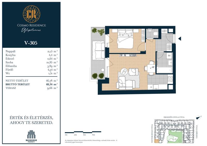 Projekt bemutatásaBudapest egyik legvonzóbb és legkeresettebb városrészében, Újlipótváros szívében egy új, exkluzív lakópark épül: az Cosmo Residence. A Hegedűs Gyula, Visegrádi, Victor Hugo és Thurzó utcák által körülhatárolt területen elhelyezkedő ingatlanfejlesztés a városrész ikonikus, nagypolgári hangulatát ötvözi, modern életstílussal, magas színvonalú építészeti megoldásokkal és első osztályú kényelemmel.A Cosmo Residence nemcsak egy újabb lakópark – hanem egy életstílus, amely a belvárosi pezsgést és a nyugodt, zöld környezetet egyaránt biztosítja lakóinak. Az ingatlan 2027. első felére készül el, és összesen 230 változatos méretű és elrendezésű lakást kínál, a 32 m2-es stúdiólakásoktól kezdve egészen a tágas, 125 m2-es, nappali + három hálószobás lakásokig. A legtöbb lakás erkéllyel rendelkezik, a legfelső szinten pedig exkluzív penthouse lakások várják azokat, akik a privát tetőterasz nyújtotta különleges panorámát szeretnék élvezni.A lakások tervezésekor több mint 4000 vevői visszajelzést vettünk figyelembe, így a terek és elrendezések maximálisan alkalmazkodnak a mai modern élet igényeihez. A belső kialakítások során lehetőség van egyedi igények figyelembevételére is, amit belsőépítészeti kollekciók segítenek. A 8 szintes épületben változatos méretű üzlethelyiségek is kialakításra kerülnek, melyek a földszinten kapnak helyet, további kényelmet biztosítva a lakók számára.A Biggeorge Property legújabb fejlesztése, a Cosmo Residence Budapest 13. kerületének közkedvelt helyszínén, Újlipótváros szívében épül, a Hegedűs Gyula, Visegrádi, Victor Hugo és Thurzó utca által határolt területen. A környék hangulatát tükröző épület 230 energiahatékony otthont kínál, amelyek megfelelnek a legújabb környezettudatos elvárásoknak. A fejlesztés részeként üzletek, tárolók és gépkocsi-beállók is kialakításra kerülnek, amelyek tovább növelik az épület lakóinak kényelmét.