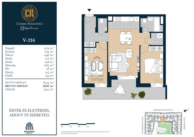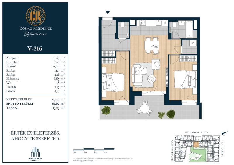 Projekt bemutatásaBudapest egyik legvonzóbb és legkeresettebb városrészében, Újlipótváros szívében egy új, exkluzív lakópark épül: az Cosmo Residence. A Hegedűs Gyula, Visegrádi, Victor Hugo és Thurzó utcák által körülhatárolt területen elhelyezkedő ingatlanfejlesztés a városrész ikonikus, nagypolgári hangulatát ötvözi, modern életstílussal, magas színvonalú építészeti megoldásokkal és első osztályú kényelemmel.A Cosmo Residence nemcsak egy újabb lakópark – hanem egy életstílus, amely a belvárosi pezsgést és a nyugodt, zöld környezetet egyaránt biztosítja lakóinak. Az ingatlan 2027. első felére készül el, és összesen 230 változatos méretű és elrendezésű lakást kínál, a 32 m2-es stúdiólakásoktól kezdve egészen a tágas, 125 m2-es, nappali + három hálószobás lakásokig. A legtöbb lakás erkéllyel rendelkezik, a legfelső szinten pedig exkluzív penthouse lakások várják azokat, akik a privát tetőterasz nyújtotta különleges panorámát szeretnék élvezni.A lakások tervezésekor több mint 4000 vevői visszajelzést vettünk figyelembe, így a terek és elrendezések maximálisan alkalmazkodnak a mai modern élet igényeihez. A belső kialakítások során lehetőség van egyedi igények figyelembevételére is, amit belsőépítészeti kollekciók segítenek. A 8 szintes épületben változatos méretű üzlethelyiségek is kialakításra kerülnek, melyek a földszinten kapnak helyet, további kényelmet biztosítva a lakók számára.A Biggeorge Property legújabb fejlesztése, a Cosmo Residence Budapest 13. kerületének közkedvelt helyszínén, Újlipótváros szívében épül, a Hegedűs Gyula, Visegrádi, Victor Hugo és Thurzó utca által határolt területen. A környék hangulatát tükröző épület 230 energiahatékony otthont kínál, amelyek megfelelnek a legújabb környezettudatos elvárásoknak. A fejlesztés részeként üzletek, tárolók és gépkocsi-beállók is kialakításra kerülnek, amelyek tovább növelik az épület lakóinak kényelmét.