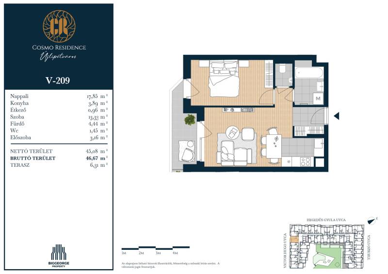 Projekt bemutatásaBudapest egyik legvonzóbb és legkeresettebb városrészében, Újlipótváros szívében egy új, exkluzív lakópark épül: az Cosmo Residence. A Hegedűs Gyula, Visegrádi, Victor Hugo és Thurzó utcák által körülhatárolt területen elhelyezkedő ingatlanfejlesztés a városrész ikonikus, nagypolgári hangulatát ötvözi, modern életstílussal, magas színvonalú építészeti megoldásokkal és első osztályú kényelemmel.A Cosmo Residence nemcsak egy újabb lakópark – hanem egy életstílus, amely a belvárosi pezsgést és a nyugodt, zöld környezetet egyaránt biztosítja lakóinak. Az ingatlan 2027. első felére készül el, és összesen 230 változatos méretű és elrendezésű lakást kínál, a 32 m2-es stúdiólakásoktól kezdve egészen a tágas, 125 m2-es, nappali + három hálószobás lakásokig. A legtöbb lakás erkéllyel rendelkezik, a legfelső szinten pedig exkluzív penthouse lakások várják azokat, akik a privát tetőterasz nyújtotta különleges panorámát szeretnék élvezni.A lakások tervezésekor több mint 4000 vevői visszajelzést vettünk figyelembe, így a terek és elrendezések maximálisan alkalmazkodnak a mai modern élet igényeihez. A belső kialakítások során lehetőség van egyedi igények figyelembevételére is, amit belsőépítészeti kollekciók segítenek. A 8 szintes épületben változatos méretű üzlethelyiségek is kialakításra kerülnek, melyek a földszinten kapnak helyet, további kényelmet biztosítva a lakók számára.A Biggeorge Property legújabb fejlesztése, a Cosmo Residence Budapest 13. kerületének közkedvelt helyszínén, Újlipótváros szívében épül, a Hegedűs Gyula, Visegrádi, Victor Hugo és Thurzó utca által határolt területen. A környék hangulatát tükröző épület 230 energiahatékony otthont kínál, amelyek megfelelnek a legújabb környezettudatos elvárásoknak. A fejlesztés részeként üzletek, tárolók és gépkocsi-beállók is kialakításra kerülnek, amelyek tovább növelik az épület lakóinak kényelmét.