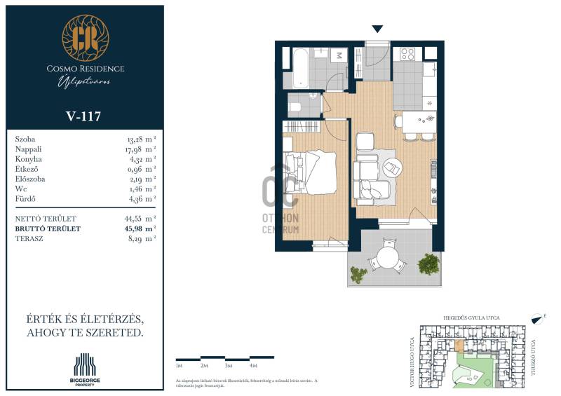 Projekt bemutatásaBudapest egyik legvonzóbb és legkeresettebb városrészében, Újlipótváros szívében egy új, exkluzív lakópark épül: az Cosmo Residence. A Hegedűs Gyula, Visegrádi, Victor Hugo és Thurzó utcák által körülhatárolt területen elhelyezkedő ingatlanfejlesztés a városrész ikonikus, nagypolgári hangulatát ötvözi, modern életstílussal, magas színvonalú építészeti megoldásokkal és első osztályú kényelemmel.A Cosmo Residence nemcsak egy újabb lakópark – hanem egy életstílus, amely a belvárosi pezsgést és a nyugodt, zöld környezetet egyaránt biztosítja lakóinak. Az ingatlan 2027. első felére készül el, és összesen 230 változatos méretű és elrendezésű lakást kínál, a 32 m2-es stúdiólakásoktól kezdve egészen a tágas, 125 m2-es, nappali + három hálószobás lakásokig. A legtöbb lakás erkéllyel rendelkezik, a legfelső szinten pedig exkluzív penthouse lakások várják azokat, akik a privát tetőterasz nyújtotta különleges panorámát szeretnék élvezni.A lakások tervezésekor több mint 4000 vevői visszajelzést vettünk figyelembe, így a terek és elrendezések maximálisan alkalmazkodnak a mai modern élet igényeihez. A belső kialakítások során lehetőség van egyedi igények figyelembevételére is, amit belsőépítészeti kollekciók segítenek. A 8 szintes épületben változatos méretű üzlethelyiségek is kialakításra kerülnek, melyek a földszinten kapnak helyet, további kényelmet biztosítva a lakók számára.A Biggeorge Property legújabb fejlesztése, a Cosmo Residence Budapest 13. kerületének közkedvelt helyszínén, Újlipótváros szívében épül, a Hegedűs Gyula, Visegrádi, Victor Hugo és Thurzó utca által határolt területen. A környék hangulatát tükröző épület 230 energiahatékony otthont kínál, amelyek megfelelnek a legújabb környezettudatos elvárásoknak. A fejlesztés részeként üzletek, tárolók és gépkocsi-beállók is kialakításra kerülnek, amelyek tovább növelik az épület lakóinak kényelmét.