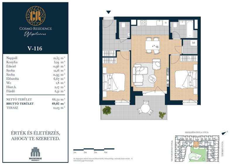 Projekt bemutatásaBudapest egyik legvonzóbb és legkeresettebb városrészében, Újlipótváros szívében egy új, exkluzív lakópark épül: az Cosmo Residence. A Hegedűs Gyula, Visegrádi, Victor Hugo és Thurzó utcák által körülhatárolt területen elhelyezkedő ingatlanfejlesztés a városrész ikonikus, nagypolgári hangulatát ötvözi, modern életstílussal, magas színvonalú építészeti megoldásokkal és első osztályú kényelemmel.A Cosmo Residence nemcsak egy újabb lakópark – hanem egy életstílus, amely a belvárosi pezsgést és a nyugodt, zöld környezetet egyaránt biztosítja lakóinak. Az ingatlan 2027. első felére készül el, és összesen 230 változatos méretű és elrendezésű lakást kínál, a 32 m2-es stúdiólakásoktól kezdve egészen a tágas, 125 m2-es, nappali + három hálószobás lakásokig. A legtöbb lakás erkéllyel rendelkezik, a legfelső szinten pedig exkluzív penthouse lakások várják azokat, akik a privát tetőterasz nyújtotta különleges panorámát szeretnék élvezni.A lakások tervezésekor több mint 4000 vevői visszajelzést vettünk figyelembe, így a terek és elrendezések maximálisan alkalmazkodnak a mai modern élet igényeihez. A belső kialakítások során lehetőség van egyedi igények figyelembevételére is, amit belsőépítészeti kollekciók segítenek. A 8 szintes épületben változatos méretű üzlethelyiségek is kialakításra kerülnek, melyek a földszinten kapnak helyet, további kényelmet biztosítva a lakók számára.A Biggeorge Property legújabb fejlesztése, a Cosmo Residence Budapest 13. kerületének közkedvelt helyszínén, Újlipótváros szívében épül, a Hegedűs Gyula, Visegrádi, Victor Hugo és Thurzó utca által határolt területen. A környék hangulatát tükröző épület 230 energiahatékony otthont kínál, amelyek megfelelnek a legújabb környezettudatos elvárásoknak. A fejlesztés részeként üzletek, tárolók és gépkocsi-beállók is kialakításra kerülnek, amelyek tovább növelik az épület lakóinak kényelmét.