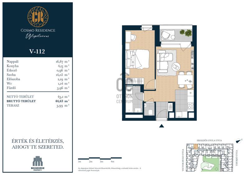 Projekt bemutatásaBudapest egyik legvonzóbb és legkeresettebb városrészében, Újlipótváros szívében egy új, exkluzív lakópark épül: az Cosmo Residence. A Hegedűs Gyula, Visegrádi, Victor Hugo és Thurzó utcák által körülhatárolt területen elhelyezkedő ingatlanfejlesztés a városrész ikonikus, nagypolgári hangulatát ötvözi, modern életstílussal, magas színvonalú építészeti megoldásokkal és első osztályú kényelemmel.A Cosmo Residence nemcsak egy újabb lakópark – hanem egy életstílus, amely a belvárosi pezsgést és a nyugodt, zöld környezetet egyaránt biztosítja lakóinak. Az ingatlan 2027. első felére készül el, és összesen 230 változatos méretű és elrendezésű lakást kínál, a 32 m2-es stúdiólakásoktól kezdve egészen a tágas, 125 m2-es, nappali + három hálószobás lakásokig. A legtöbb lakás erkéllyel rendelkezik, a legfelső szinten pedig exkluzív penthouse lakások várják azokat, akik a privát tetőterasz nyújtotta különleges panorámát szeretnék élvezni.A lakások tervezésekor több mint 4000 vevői visszajelzést vettünk figyelembe, így a terek és elrendezések maximálisan alkalmazkodnak a mai modern élet igényeihez. A belső kialakítások során lehetőség van egyedi igények figyelembevételére is, amit belsőépítészeti kollekciók segítenek. A 8 szintes épületben változatos méretű üzlethelyiségek is kialakításra kerülnek, melyek a földszinten kapnak helyet, további kényelmet biztosítva a lakók számára.A Biggeorge Property legújabb fejlesztése, a Cosmo Residence Budapest 13. kerületének közkedvelt helyszínén, Újlipótváros szívében épül, a Hegedűs Gyula, Visegrádi, Victor Hugo és Thurzó utca által határolt területen. A környék hangulatát tükröző épület 230 energiahatékony otthont kínál, amelyek megfelelnek a legújabb környezettudatos elvárásoknak. A fejlesztés részeként üzletek, tárolók és gépkocsi-beállók is kialakításra kerülnek, amelyek tovább növelik az épület lakóinak kényelmét.