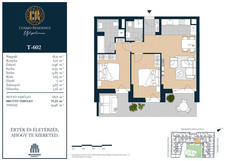 Projekt bemutatásaBudapest egyik legvonzóbb és legkeresettebb városrészében, Újlipótváros szívében egy új, exkluzív lakópark épül: az Cosmo Residence. A Hegedűs Gyula, Visegrádi, Victor Hugo és Thurzó utcák által körülhatárolt területen elhelyezkedő ingatlanfejlesztés a városrész ikonikus, nagypolgári hangulatát ötvözi, modern életstílussal, magas színvonalú építészeti megoldásokkal és első osztályú kényelemmel.A Cosmo Residence nemcsak egy újabb lakópark – hanem egy életstílus, amely a belvárosi pezsgést és a nyugodt, zöld környezetet egyaránt biztosítja lakóinak. Az ingatlan 2027. első felére készül el, és összesen 230 változatos méretű és elrendezésű lakást kínál, a 32 m2-es stúdiólakásoktól kezdve egészen a tágas, 125 m2-es, nappali + három hálószobás lakásokig. A legtöbb lakás erkéllyel rendelkezik, a legfelső szinten pedig exkluzív penthouse lakások várják azokat, akik a privát tetőterasz nyújtotta különleges panorámát szeretnék élvezni.A lakások tervezésekor több mint 4000 vevői visszajelzést vettünk figyelembe, így a terek és elrendezések maximálisan alkalmazkodnak a mai modern élet igényeihez. A belső kialakítások során lehetőség van egyedi igények figyelembevételére is, amit belsőépítészeti kollekciók segítenek. A 8 szintes épületben változatos méretű üzlethelyiségek is kialakításra kerülnek, melyek a földszinten kapnak helyet, további kényelmet biztosítva a lakók számára.A Biggeorge Property legújabb fejlesztése, a Cosmo Residence Budapest 13. kerületének közkedvelt helyszínén, Újlipótváros szívében épül, a Hegedűs Gyula, Visegrádi, Victor Hugo és Thurzó utca által határolt területen. A környék hangulatát tükröző épület 230 energiahatékony otthont kínál, amelyek megfelelnek a legújabb környezettudatos elvárásoknak. A fejlesztés részeként üzletek, tárolók és gépkocsi-beállók is kialakításra kerülnek, amelyek tovább növelik az épület lakóinak kényelmét.