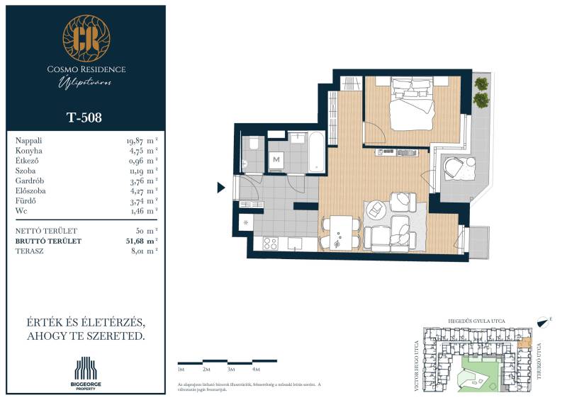 Projekt bemutatásaBudapest egyik legvonzóbb és legkeresettebb városrészében, Újlipótváros szívében egy új, exkluzív lakópark épül: az Cosmo Residence. A Hegedűs Gyula, Visegrádi, Victor Hugo és Thurzó utcák által körülhatárolt területen elhelyezkedő ingatlanfejlesztés a városrész ikonikus, nagypolgári hangulatát ötvözi, modern életstílussal, magas színvonalú építészeti megoldásokkal és első osztályú kényelemmel.A Cosmo Residence nemcsak egy újabb lakópark – hanem egy életstílus, amely a belvárosi pezsgést és a nyugodt, zöld környezetet egyaránt biztosítja lakóinak. Az ingatlan 2027. első felére készül el, és összesen 230 változatos méretű és elrendezésű lakást kínál, a 32 m2-es stúdiólakásoktól kezdve egészen a tágas, 125 m2-es, nappali + három hálószobás lakásokig. A legtöbb lakás erkéllyel rendelkezik, a legfelső szinten pedig exkluzív penthouse lakások várják azokat, akik a privát tetőterasz nyújtotta különleges panorámát szeretnék élvezni.A lakások tervezésekor több mint 4000 vevői visszajelzést vettünk figyelembe, így a terek és elrendezések maximálisan alkalmazkodnak a mai modern élet igényeihez. A belső kialakítások során lehetőség van egyedi igények figyelembevételére is, amit belsőépítészeti kollekciók segítenek. A 8 szintes épületben változatos méretű üzlethelyiségek is kialakításra kerülnek, melyek a földszinten kapnak helyet, további kényelmet biztosítva a lakók számára.A Biggeorge Property legújabb fejlesztése, a Cosmo Residence Budapest 13. kerületének közkedvelt helyszínén, Újlipótváros szívében épül, a Hegedűs Gyula, Visegrádi, Victor Hugo és Thurzó utca által határolt területen. A környék hangulatát tükröző épület 230 energiahatékony otthont kínál, amelyek megfelelnek a legújabb környezettudatos elvárásoknak. A fejlesztés részeként üzletek, tárolók és gépkocsi-beállók is kialakításra kerülnek, amelyek tovább növelik az épület lakóinak kényelmét.