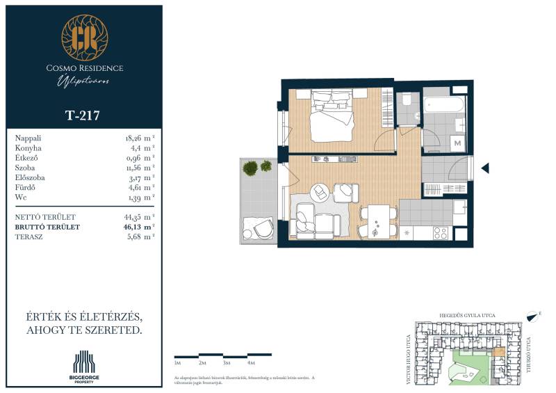 Projekt bemutatásaBudapest egyik legvonzóbb és legkeresettebb városrészében, Újlipótváros szívében egy új, exkluzív lakópark épül: az Cosmo Residence. A Hegedűs Gyula, Visegrádi, Victor Hugo és Thurzó utcák által körülhatárolt területen elhelyezkedő ingatlanfejlesztés a városrész ikonikus, nagypolgári hangulatát ötvözi, modern életstílussal, magas színvonalú építészeti megoldásokkal és első osztályú kényelemmel.A Cosmo Residence nemcsak egy újabb lakópark – hanem egy életstílus, amely a belvárosi pezsgést és a nyugodt, zöld környezetet egyaránt biztosítja lakóinak. Az ingatlan 2027. első felére készül el, és összesen 230 változatos méretű és elrendezésű lakást kínál, a 32 m2-es stúdiólakásoktól kezdve egészen a tágas, 125 m2-es, nappali + három hálószobás lakásokig. A legtöbb lakás erkéllyel rendelkezik, a legfelső szinten pedig exkluzív penthouse lakások várják azokat, akik a privát tetőterasz nyújtotta különleges panorámát szeretnék élvezni.A lakások tervezésekor több mint 4000 vevői visszajelzést vettünk figyelembe, így a terek és elrendezések maximálisan alkalmazkodnak a mai modern élet igényeihez. A belső kialakítások során lehetőség van egyedi igények figyelembevételére is, amit belsőépítészeti kollekciók segítenek. A 8 szintes épületben változatos méretű üzlethelyiségek is kialakításra kerülnek, melyek a földszinten kapnak helyet, további kényelmet biztosítva a lakók számára.A Biggeorge Property legújabb fejlesztése, a Cosmo Residence Budapest 13. kerületének közkedvelt helyszínén, Újlipótváros szívében épül, a Hegedűs Gyula, Visegrádi, Victor Hugo és Thurzó utca által határolt területen. A környék hangulatát tükröző épület 230 energiahatékony otthont kínál, amelyek megfelelnek a legújabb környezettudatos elvárásoknak. A fejlesztés részeként üzletek, tárolók és gépkocsi-beállók is kialakításra kerülnek, amelyek tovább növelik az épület lakóinak kényelmét.
