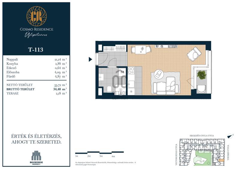 Projekt bemutatásaBudapest egyik legvonzóbb és legkeresettebb városrészében, Újlipótváros szívében egy új, exkluzív lakópark épül: az Cosmo Residence. A Hegedűs Gyula, Visegrádi, Victor Hugo és Thurzó utcák által körülhatárolt területen elhelyezkedő ingatlanfejlesztés a városrész ikonikus, nagypolgári hangulatát ötvözi, modern életstílussal, magas színvonalú építészeti megoldásokkal és első osztályú kényelemmel.A Cosmo Residence nemcsak egy újabb lakópark – hanem egy életstílus, amely a belvárosi pezsgést és a nyugodt, zöld környezetet egyaránt biztosítja lakóinak. Az ingatlan 2027. első felére készül el, és összesen 230 változatos méretű és elrendezésű lakást kínál, a 32 m2-es stúdiólakásoktól kezdve egészen a tágas, 125 m2-es, nappali + három hálószobás lakásokig. A legtöbb lakás erkéllyel rendelkezik, a legfelső szinten pedig exkluzív penthouse lakások várják azokat, akik a privát tetőterasz nyújtotta különleges panorámát szeretnék élvezni.A lakások tervezésekor több mint 4000 vevői visszajelzést vettünk figyelembe, így a terek és elrendezések maximálisan alkalmazkodnak a mai modern élet igényeihez. A belső kialakítások során lehetőség van egyedi igények figyelembevételére is, amit belsőépítészeti kollekciók segítenek. A 8 szintes épületben változatos méretű üzlethelyiségek is kialakításra kerülnek, melyek a földszinten kapnak helyet, további kényelmet biztosítva a lakók számára.A Biggeorge Property legújabb fejlesztése, a Cosmo Residence Budapest 13. kerületének közkedvelt helyszínén, Újlipótváros szívében épül, a Hegedűs Gyula, Visegrádi, Victor Hugo és Thurzó utca által határolt területen. A környék hangulatát tükröző épület 230 energiahatékony otthont kínál, amelyek megfelelnek a legújabb környezettudatos elvárásoknak. A fejlesztés részeként üzletek, tárolók és gépkocsi-beállók is kialakításra kerülnek, amelyek tovább növelik az épület lakóinak kényelmét.