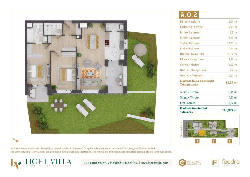 Projekt bemutatásaAki többre vágyik, mint egy átlagos lakópark, most hazaérkezett! Itt élni, itt lakástulajdonosnak lenni, egyet jelent a minőséggel.Az épületrőlA pesti diplomatanegyed legszebb utcájában épül, a megjelenésében, műszaki tartalmában és a lakáskínálata tekintetében egyaránt unikális, Liget Villa Lakópark. Az épületbe érve, egy elegáns lobby és recepcióra érkezünk majd. Innen a három épületet egy kerti úton, passzázs köti majd össze. A tervezés során nagy hangsúlyt kapott a családi igényekre tervezett lakás minőségi használhatósága. Ablakos konyhák, master bedroom-ok, dupla fürdőszobák, gardrób és háztartási helyiségek is helyet kapnak a lakásban. Kiemelten jól bútorzható, két irányba tájolt lakások kerülnek kialakításra. A földszinti lakásokhoz 50-100 m2-es privát kertek, míg a közös területeken tájépítész által tervezett reprezentatív kertet alakítunk ki. A lakásokban mennyezeti hűtés-fűtés biztosítja a téli-nyári kellemes komfortérzetet. A nyílászárók 3 rétegű üveggel, alu-fa kivitelben kerülnek beépítésre. A lakások ára tartalmazza alapárban az alu elektromos redőnyöket és okosotthon kiépítést is. Magas minőségű olasz és spanyol hidegburkolatválasztékban akár 60x60 cm-es lapok is válaszhatóak majd. A fa parketta és az átlag feletti minőség szaniterek, szintén alapárban válaszhatóak a lakásokba. Az épületek alatti mélygarázsban gépkocsibeállók és tárolók kerülnek kialakításra. A környékről:A környék közlekedése kiváló. 5 perc sétával elérhető a Andrássy úton a kisföldalatti. A szomszédos Balzac utcában és Dózsa György úton is számos buszjárat és troli is közlekedik. A város számos pontjára, akár átszállás nélkül is eljuthatunk. Ha pedig autóval közlekedünk, az M3 autópálya pár perc alatt elérhető. A Városligeti fasor két oldalán található szervízúton, parkolnia is lehet a Liget Villa Lakóparkba érkezőknek.Előnyök:A Liget Villa Lakpark lakásai, tökéletes választás azoknak, akik szeretnék élvezni a városi kényelmet anélkül, hogy lemondanának a természet közelségéről és a csendes életformáról. A belváros és a zöld liget is sétatávolságban elérhető. A gyerekek számára paradicsom a Városliget. Játszóterek, tó, sportpályák, állatkert, minden, amit egy gyerek csak kívánhat egy parkban. A közelben pedig a kultúrát és a sportos életformát kedvelők, egyaránt megtalálják a számukra fontos helyszíneket. Néprajzi, Szépművészeti, Mezőgazdasági múzeumok, a Magyar Zene Háza, a Műcsarnok mind-mind gazdag élményt nyújtanak az oda látogatóknak. A Városliget fasor pedig már önmagában egy oázis a városi környezetben. Hatalmas gesztenyefák, gyönyörű villaépületek, követségek, gimnázium, templom mellett sétálhatunk el nap mint nap. Ide nagyon jó lesz minden nap hazajönni.