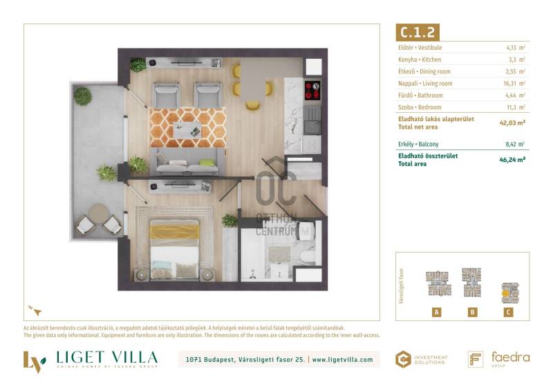 Projekt bemutatásaAki többre vágyik, mint egy átlagos lakópark, most hazaérkezett! Itt élni, itt lakástulajdonosnak lenni, egyet jelent a minőséggel.Az épületrőlA pesti diplomatanegyed legszebb utcájában épül, a megjelenésében, műszaki tartalmában és a lakáskínálata tekintetében egyaránt unikális, Liget Villa Lakópark. Az épületbe érve, egy elegáns lobby és recepcióra érkezünk majd. Innen a három épületet egy kerti úton, passzázs köti majd össze. A tervezés során nagy hangsúlyt kapott a családi igényekre tervezett lakás minőségi használhatósága. Ablakos konyhák, master bedroom-ok, dupla fürdőszobák, gardrób és háztartási helyiségek is helyet kapnak a lakásban. Kiemelten jól bútorzható, két irányba tájolt lakások kerülnek kialakításra. A földszinti lakásokhoz 50-100 m2-es privát kertek, míg a közös területeken tájépítész által tervezett reprezentatív kertet alakítunk ki. A lakásokban mennyezeti hűtés-fűtés biztosítja a téli-nyári kellemes komfortérzetet. A nyílászárók 3 rétegű üveggel, alu-fa kivitelben kerülnek beépítésre. A lakások ára tartalmazza alapárban az alu elektromos redőnyöket és okosotthon kiépítést is. Magas minőségű olasz és spanyol hidegburkolatválasztékban akár 60x60 cm-es lapok is válaszhatóak majd. A fa parketta és az átlag feletti minőség szaniterek, szintén alapárban válaszhatóak a lakásokba. Az épületek alatti mélygarázsban gépkocsibeállók és tárolók kerülnek kialakításra. A környékről:A környék közlekedése kiváló. 5 perc sétával elérhető a Andrássy úton a kisföldalatti. A szomszédos Balzac utcában és Dózsa György úton is számos buszjárat és troli is közlekedik. A város számos pontjára, akár átszállás nélkül is eljuthatunk. Ha pedig autóval közlekedünk, az M3 autópálya pár perc alatt elérhető. A Városligeti fasor két oldalán található szervízúton, parkolnia is lehet a Liget Villa Lakóparkba érkezőknek.Előnyök:A Liget Villa Lakpark lakásai, tökéletes választás azoknak, akik szeretnék élvezni a városi kényelmet anélkül, hogy lemondanának a természet közelségéről és a csendes életformáról. A belváros és a zöld liget is sétatávolságban elérhető. A gyerekek számára paradicsom a Városliget. Játszóterek, tó, sportpályák, állatkert, minden, amit egy gyerek csak kívánhat egy parkban. A közelben pedig a kultúrát és a sportos életformát kedvelők, egyaránt megtalálják a számukra fontos helyszíneket. Néprajzi, Szépművészeti, Mezőgazdasági múzeumok, a Magyar Zene Háza, a Műcsarnok mind-mind gazdag élményt nyújtanak az oda látogatóknak. A Városliget fasor pedig már önmagában egy oázis a városi környezetben. Hatalmas gesztenyefák, gyönyörű villaépületek, követségek, gimnázium, templom mellett sétálhatunk el nap mint nap. Ide nagyon jó lesz minden nap hazajönni.