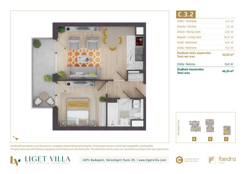 Projekt bemutatásaAki többre vágyik, mint egy átlagos lakópark, most hazaérkezett! Itt élni, itt lakástulajdonosnak lenni, egyet jelent a minőséggel.Az épületrőlA pesti diplomatanegyed legszebb utcájában épül, a megjelenésében, műszaki tartalmában és a lakáskínálata tekintetében egyaránt unikális, Liget Villa Lakópark. Az épületbe érve, egy elegáns lobby és recepcióra érkezünk majd. Innen a három épületet egy kerti úton, passzázs köti majd össze. A tervezés során nagy hangsúlyt kapott a családi igényekre tervezett lakás minőségi használhatósága. Ablakos konyhák, master bedroom-ok, dupla fürdőszobák, gardrób és háztartási helyiségek is helyet kapnak a lakásban. Kiemelten jól bútorzható, két irányba tájolt lakások kerülnek kialakításra. A földszinti lakásokhoz 50-100 m2-es privát kertek, míg a közös területeken tájépítész által tervezett reprezentatív kertet alakítunk ki. A lakásokban mennyezeti hűtés-fűtés biztosítja a téli-nyári kellemes komfortérzetet. A nyílászárók 3 rétegű üveggel, alu-fa kivitelben kerülnek beépítésre. A lakások ára tartalmazza alapárban az alu elektromos redőnyöket és okosotthon kiépítést is. Magas minőségű olasz és spanyol hidegburkolatválasztékban akár 60x60 cm-es lapok is válaszhatóak majd. A fa parketta és az átlag feletti minőség szaniterek, szintén alapárban válaszhatóak a lakásokba. Az épületek alatti mélygarázsban gépkocsibeállók és tárolók kerülnek kialakításra. A környékről:A környék közlekedése kiváló. 5 perc sétával elérhető a Andrássy úton a kisföldalatti. A szomszédos Balzac utcában és Dózsa György úton is számos buszjárat és troli is közlekedik. A város számos pontjára, akár átszállás nélkül is eljuthatunk. Ha pedig autóval közlekedünk, az M3 autópálya pár perc alatt elérhető. A Városligeti fasor két oldalán található szervízúton, parkolnia is lehet a Liget Villa Lakóparkba érkezőknek.Előnyök:A Liget Villa Lakpark lakásai, tökéletes választás azoknak, akik szeretnék élvezni a városi kényelmet anélkül, hogy lemondanának a természet közelségéről és a csendes életformáról. A belváros és a zöld liget is sétatávolságban elérhető. A gyerekek számára paradicsom a Városliget. Játszóterek, tó, sportpályák, állatkert, minden, amit egy gyerek csak kívánhat egy parkban. A közelben pedig a kultúrát és a sportos életformát kedvelők, egyaránt megtalálják a számukra fontos helyszíneket. Néprajzi, Szépművészeti, Mezőgazdasági múzeumok, a Magyar Zene Háza, a Műcsarnok mind-mind gazdag élményt nyújtanak az oda látogatóknak. A Városliget fasor pedig már önmagában egy oázis a városi környezetben. Hatalmas gesztenyefák, gyönyörű villaépületek, követségek, gimnázium, templom mellett sétálhatunk el nap mint nap. Ide nagyon jó lesz minden nap hazajönni.
