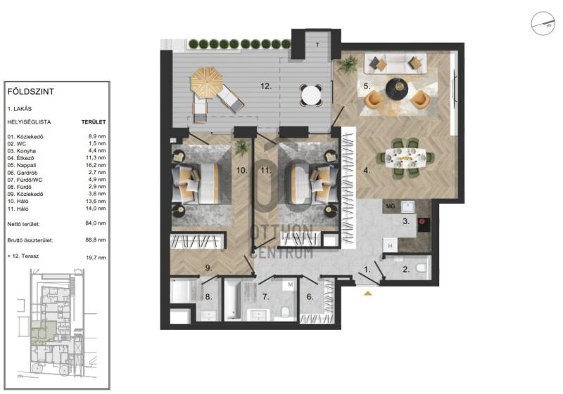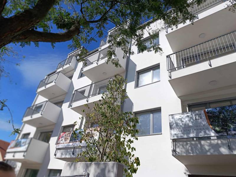 XIII. kerület zöldövezeti városnegyedében 33 lakásos társasház- liftes társasház- 3 szobás ingatlan- 88,8 nm alapterületű, 19,9 nm-es terasszal- földszinti, kertkapcsolatos- 3 szobás (amerikai konyhás nappali + 2 háló)- a tulajdonosok kényelmét biztosítja a háztartási helyiség, valamint a 2 mellékhelyiség- fűtés, hűtés: levegős hőszivattyús rendszert használ, mennyezeti fűtés-hűtés kialakítással- a lakás belső ajtókkal, burkolatokkal, szaniterekkel kerül átadásra- gépkocsi beálló külön vásárolhatóTovábbi információval, megtekintéssel kapcsolatban keressen bizalommal!Projekt bemutatásaXIII. kerület kertvárosi, zöldövezeti negyedének központjában kimagasló műszaki felszereltséggel rendelkező lakások várják új tulajdonosaikat.Az ingatlanok modern kialakítása, látványos homlokzata, valamint a hőszivattyús fűtésrendszerük által biztosított alacsony rezsiköltség ideális választást jelentenek igényes, tudatos vásárlók és ingatlanbefektetők számára.A projekt keretén belül egy 33 lakásos, modern, újépítésű társasház kerül felépítésre.Főbb jellemzők:• a projekt egy 33 lakásos emelt minőségű, társasházi beruházás keretein belül valósul meg• a társasházban 33 személygépkocsi beállóhely található a -1-es pinceszinten• a kiválasztott lakásokhoz tároló helyiségek is vásárolhatók, akár önállóan akár közvetlen autóbeálló kapcsolattal is• a lakások 30-84 m² közötti változó méretűek, elrendezésben a garzontól az egy- két- és három hálószobásig választhatóak• a földszinti lakások mindegyike saját privát kerttel és/vagy nagy alapterületű terasszal rendelkezik•az épület összes lakó egysége saját-kizárólagos használatú erkéllyel, terasszal és/vagy loggiával rendelkezikFizetési ütemezés: 20-80%A lakások várható birtokbaadása: 2025. IV. negyedévJelenlegi készültségi fok: 90%