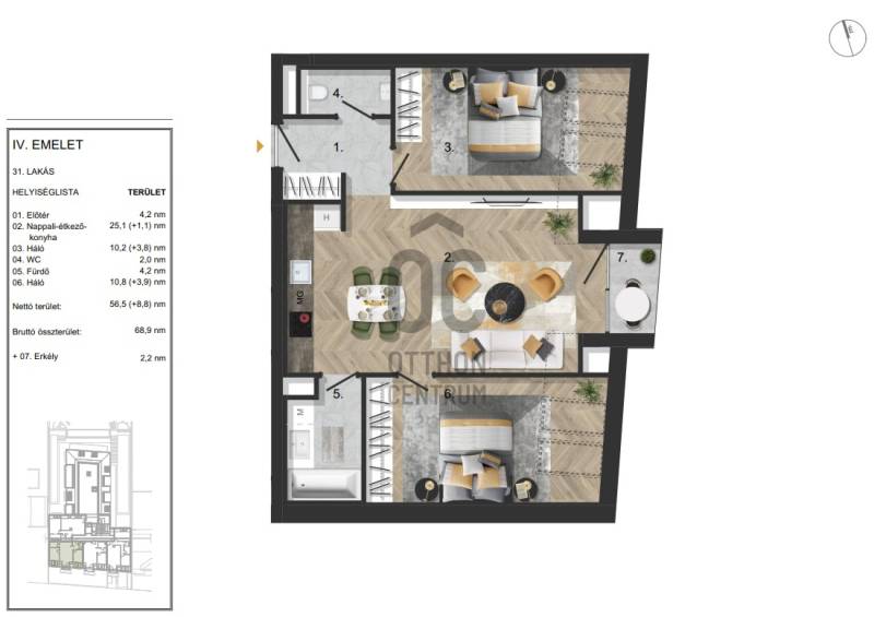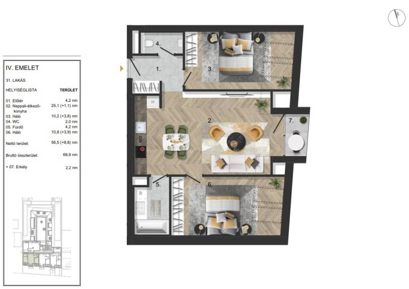 XIII. kerület zöldövezeti városnegyedében 33 lakásos társasház- liftes társasház- 3 szobás ingatlan- 56,5 nm (+8,8 nm) alapterületű, 2,2 nm-es terasszal- 4.emeleti, keleti fekvésű- 3 szobás (amerikai konyhás nappali + 2 háló)- fűtés, hűtés: levegős hőszivattyús rendszert használ, mennyezeti fűtés-hűtés kialakítással- a lakás belső ajtókkal, burkolatokkal, szaniterekkel kerül átadásra- gépkocsi beálló külön vásárolhatóTovábbi információval, megtekintéssel kapcsolatban keressen bizalommal!Projekt bemutatásaXIII. kerület kertvárosi, zöldövezeti negyedének központjában kimagasló műszaki felszereltséggel rendelkező lakások várják új tulajdonosaikat.Az ingatlanok modern kialakítása, látványos homlokzata, valamint a hőszivattyús fűtésrendszerük által biztosított alacsony rezsiköltség ideális választást jelentenek igényes, tudatos vásárlók és ingatlanbefektetők számára.A projekt keretén belül egy 33 lakásos, modern, újépítésű társasház kerül felépítésre.Főbb jellemzők:• a projekt egy 33 lakásos emelt minőségű, társasházi beruházás keretein belül valósul meg• a társasházban 33 személygépkocsi beállóhely található a -1-es pinceszinten• a kiválasztott lakásokhoz tároló helyiségek is vásárolhatók, akár önállóan akár közvetlen autóbeálló kapcsolattal is• a lakások 30-84 m² közötti változó méretűek, elrendezésben a garzontól az egy- két- és három hálószobásig választhatóak• a földszinti lakások mindegyike saját privát kerttel és/vagy nagy alapterületű terasszal rendelkezik•az épület összes lakó egysége saját-kizárólagos használatú erkéllyel, terasszal és/vagy loggiával rendelkezikFizetési ütemezés: 20-80%A lakások várható birtokbaadása: 2025. IV. negyedévJelenlegi készültségi fok: 90%