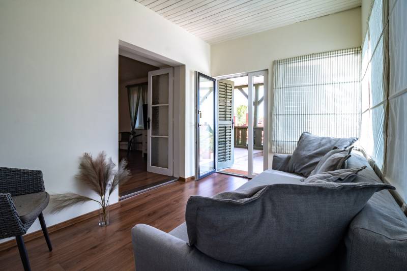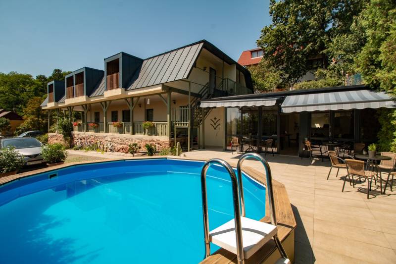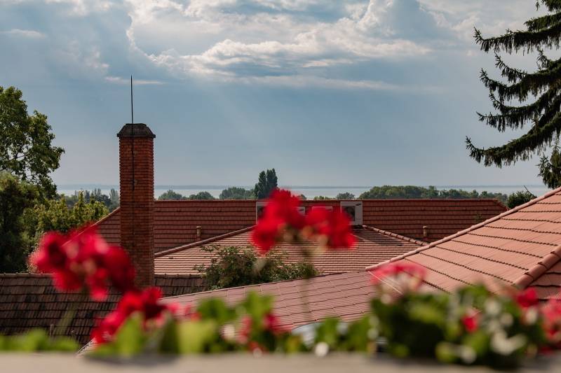 Kiváló befektetés! Most 55 millió Ft-tal olcsóbban megveheti. Balatonalmádi központjának, csendes mellékutcájában 2 éve teljesen felújított 9 db. kisebb apartmanból, 2 db. lakosztályból, 1 db. konyha-étteremből álló villa épület panorámás teraszokkal, erkélyekkel, kültéri medencével, pincével, 9-10 gépkocsi részére alkalmas felszíni beállóval, 756 m2-es telken eladó. Az ingatlan egész évben kiválóan alkalmas szálláshelynek vagy kisebb átalakítással, társasháznak, irodának, klinikának, idősek otthonának. A villaépület a XX. század elején épült. A földszintet 60-80 cm vtg. kőfalak veszik körül, az emelet acélvázas manzárd tetős kialakítást kapott 1993 és 1996 között. A tetőtérben 10 cm hőszigetelés és gipszkarton borítás került, a tető álkorcos fémlemezfedéssell lett borítva. A teraszok 2 cm vtg. fa és kerámia burkolatokkal vannak ellátva. Földszinten hagyományos radiátoros fűtés van. A vastag falak miatt nem indokolt a hűtés. Az emeleten 8 szobában és a 2 földszinti lakosztályban Gree típusú fűtő-hűtő klíma került. Teljesen fel lett újítva a víz, villany, fűtés hálózat, új szaniterek, csaptelepek, klímák, belső ajtók, homlokzati nyílászárók, homlokzat, tető, burkolatok, festés, berendezési tárgyak, bútorok, gépek.A villamos hálózat 3 fázisú, minden egyes helyiség külön biztosítékon van. Vendék kapacitás 32 fő. Társasház esetén a kialakítható egységek száma korlátlan. Az ingatlant 100 millió Ft. összegű, 2,5%-os hitel terheli még 7,5 évig, mely a tulajdonos cég megvásárlásával át is vállalható. 50 m2 erejéig bővíthető még az ingatlan. Igény esetén a jelenlegi tulajdonos segít az üzemeltetésben. Bankfüggetlen, díjmentes hiteltanácsadással is segítjük ügyfeleinket. Hívjon bizalommal!