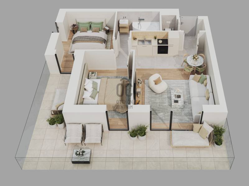 Projekt bemutatásaÉPÜLETSZERKEZETEK, KÖZPONTI GÉPÉSZET, ELEKTROMOSSÁG AlapozásPontalapozás és 25 cm vtg. vasbeton lemezalappal készülő szerkezet.Teherhordó vázszerkezetAz épületek hagyományos építési módban kerülnek kivitelezésre, monolit vasbeton vázszerkezettel, statikailagméretezett monolit vasbeton födémekkel, kitöltő kerámia és pórusbeton falakkal.FalakA pincefalak, a lépcsőházak és liftaknák körítő falai, valamint a szükséges merevítő falak vasbetonból készülnek. A külsőtérelhatároló falak Porotherm® vázkerámia és Silka® pórusbeton vázkitöltő falazatok. Mind a téglafalazatok, mindvasbeton falak az előírt hőtechnikai méretezésnek megfelelő vastagságú Austrotherm®, ill. Knauf Insulation®hőszigetelő rendszerrel készülnek. Az épületeken belüli lakáselválasztó falak hangtechnikai méretezésnek megfelelőnagyszilárdságú vázkerámia falazóblokkokból készülnek, a szükséges helyeken vasbeton pillérekkel, merevítő falakkal.A lakásokon belüli válaszfalak falazóblokkokból készülnek, a lakáselosztók szereléséhez Rigips® gipszkartonszerkezetű álmennyezet készül.FödémekA lakások területein alul, felül sík monolit vasbeton födémek készülnek rejtett gerendákkal, homlokzati síkonperemgerendákkal. A födémeken a lépés-hanggátlás biztosítására akusztikailag minősített szigetelésen úsztatottaljzatbeton készül, mely egyben a burkolatok fogadó szerkezete is.TetőfedésAz épületek fedése antracit színű Prefa® korcolt lemez fedéssel ellátott tetőfelületek.Külső nyílászárókAz Internorm® ablakok, tolóajtók és erkélyajtók külső oldalon antracit színű, alumínium vértezetű, belső oldalon fehérszínű, korszerű minimum Uw=1,0 W/m2K hőátbocsátási értékű, műanyag profilrendszerből készülnek, 3 rétegűhőszigetelő üvegezéssel, jó légzárással, továbbá akusztikailag megfelelő szerkezettel. A biztonságos és kényelmesszellőztetés biztosítása érdekében a műanyag nyílászáróval rendelkező lakásokban legalább egy nyílászárónrésszellőző elem kerül elhelyezésre. A műanyag homlokzati nyílászárók Schlotterer® redőnyszekrénnyel (redőny palástnélkül), illetve motoros mozgatás előkészítéssel a redőnyszekrényeknél elektromos kiállással (motor és távirányítónélkül) kerülnek beépítésre.Erkélyek, teraszokAz erkélyek csúszásmentesített fagyálló kerámia-, vagy gres járólappal, a teraszok csúszásmentesített fagyálló kerámiavagy gress járólappal burkoltak.Az erkélykorlátok rozsdamentes lakatos szerkezetűek, biztonsági üveg betéttel.Homlokzatok15 cm vastagságú homlokzati hőszigetelő rendszer. Mapei® rendszerű, kapart nemes vakolat felületképzés, fehérszínben, antracit nyílászáró parapet betétekkel. ÁlmennyezetA lakások egyes helyiségeiben (pl. előtér, WC, fürdő), valamint a közös területi közlekedőkben műszakiszükségességből Rigips® álmennyezet kerülhet kialakításra az elektromos és gépészeti vezetékek, berendezésektakarására.Liftek, közlekedőkÉpületenként 1db 8 személyes 630 kg teherbírású, Kleemann típusú személyfelvonó berendezés kerülbeépítésre.Esetleg még az elektromos részhez hozzá lehetne írni a felvonó elektromos betáplálása 3x20 A  legfelső szinten afelvonó akna melletti részen kerüljön kiépítésre. Valamint EPH vezeték kiépítése szükséges felvonósüllyesztéki részében. A hőszigetelt belső térben lévő liftek előtere és a belső közlekedők csúszásmentes gresslap vagy kerámia burkolattalkészülnek.GarázsAz épületek alatt és az épületek közötti terület alatt, összefüggő teremgarázs kerül kialakításra. A teremgarázsokvakolatlan, nyers vasbeton falakkal és födémekkel, járófelületén felületkeményített beton burkolattal készülnek.ÉpületgépészetAz épületek teljesítik a 7/2006. TNM rendelet közel nulla energiaigényű épületekre vonatkozó követelményeit.A melegvíz ellátását lakásonként a fürdőszobában esztétikus kialakítással 100 l-es Ariston Velis Pro 100 EU designbojler biztosítja.A gépészeti csővezetékek eltakarva a felszállóaknában, álmennyezetben, ill. a betonfödémbe kerülnek elhelyezésre. Azalkalmazott csővezetékek, szénacélcső press idom technológiai kötéssel, ötrétegű műanyag cső víz- és fűtési vezeték,PVC és PE hangcsillapított lefolyóvezeték és acéllemez illetve PE légcsatorna.Helyi kisventilátorokkal biztosítjuk a fürdőszobák és a WC helyiségek légcseréjét, kivételt képez, ahol természetesszellőzés megoldható ablakon keresztül. A konyhában d125-ös méretű szellőzőcső a falsíkig épül meg, ide vanlehetőség csatlakoztatni a szagelszívót. A szellőzőcső a lapostető fölé kerül kivezetésre.A földszint közlekedői, garázsterei gépi szellőzés nélküliek, a tárolók és a gépészeti helyiségek szellőzése a tárolóajtókon keresztüli gravitációs szellőzéssel megoldott.Az épületek vízigényét a külső közműről önálló bekötés biztosítja. Az épületen belül a szennyvíz és a csapadékvízelvezetése szétválasztott hálózaton történik.A lakások fűtése és hűtése a folyamatos tartózkodásra szolgáló helyiségekben padlófűtési és fan-coil hűtési rendszerrelvalósul meg. A szükséges hőenergiát 2db központi gépészeti helyiségben kaszkád kapcsolásban üzemelő Daikin levegő-víz hőszivattyúk alkalmazásával állítjuk elő.A gépészeti helyiségekben kerülnek elhelyezésre a további szükséges szerelvények, puffer tárolók és keringetőszivattyúk.ElektromosságA felszín feletti elektromos hálózat (lakásokon belüli is) födémszerkezetben, falban, aknában, álmennyezeti térben,valamint padlóbetonban szerelt védőcsövekbe húzott vezetékekkel készül. Az