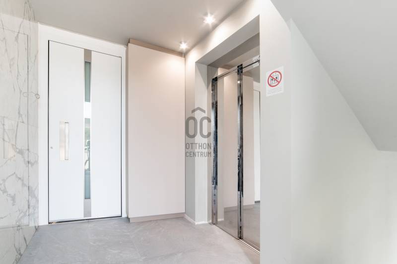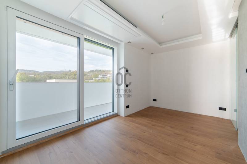 Eladásra kínálunk egy első emeleti lakást ebben a háromlakásos társasházban Madárhegy és Gazdagrét között, gyönyörű panorámával a Péter- és Vadászhegyre.Az épület jellegének, karakterének meghatározásánál figyelembe vették a szomszédos ingatlanok helyzetét, tájolását, növényzetét és beépíthetőségét. Teraszház jellegű épület tömeg került kialakításra modernséget tükröző arányrendszerrel úgy, hogy az Észak-keleti homlokzat és az út csatlakozás felőli Dél-keleti homlokzat zárt Keleti sarokban elhelyezett lépcsőházzal, míg a szomszédos kertek felé néző napos, panorámás Dél-nyugati homlokzat az Észak-nyugati homlokzat felé fordulva nyitott lakótérhez nagy üvegfelületekkel kapcsolódó nagy teraszokkal.Alaprajzi elrendezésben a lakások tágas lifttel ellátott világos lépcsőházból közelíthetők meg. A lakásokba lépve előtérbe érkezünk, mely közvetlenül az amerikai konyhás nappalikba vezet, ahonnan szép kilátás nyílik a nagyméretű üvegfalakon keresztül. A nappali tér nagyméretű tolóajtókkal nyitható össze a teraszokkal, így élvezhetővé válik a lakókert és a kertvárosi környezet a lakásokban élők számára. A lakások egyik hálószobája a nappaliból nyílik, míg a többi háló elkülönülve külön terasszal kerül kialakításra. Minden hálószobához tartozik fürdő és gardrób.A tervezett lakóépület pince, földszint és két emeleti szinttel kerül kialakításra. A földszinten és a két emeleten egy-egy lakás valósul meg, összesen tehát három lakás. A felső szinten lévő lakáshoz 65 m2-es kizárólagos használatú tetőterasz épül.A kiszolgálóhelyiségek a pinceszinten helyezkednek el. Itt négy darab gépkocsi parkoló, bicikli, takarítószer, kertieszköz, kuka és a lakásokhoz tartozó tárolók lesznek kialakítva. A parkolókhoz elektromos autó töltőállomás kerül kialakításra.A ház természetes klímáját a 44 cm vastag, hőszigeteléssel ellátott külső térelhatároló falszerkezetek, valamint a nappali és a szobák nagy üvegfelületei előtt végig futó vízszintes előtetők-árnyékolók, az INTERNORM - STUDIO KF500-as üvegfalak-ajtók-ablakok - Hőszigetelés (W/m²K-ig) Uw 0,61 - és az üveg szerkezetek előtt futó árnyékolók, zsaluziák biztosítják. A külső nyíllászárók maximális RC1N, RC2 betörés elleni védelmet nyújtanak, és a lakások lépcsőházból nyíló ajtói MABISZ minősítéssel rendelkeznek. Külső határoló falai 44 Pth téglából készültek, Internorm homlokzati nyílászárókkal ellátva, zsaluzia távirányítható árnyékolóval kiegészítve. Külső homlokzaton nem éghető 6 cm vtg kőzetgyapot hőszigetelés található.A födémek monolit vasbeton, ugyanúgy, mint a lépcsőház és liftakna és az épülethosszában végig menő merevítő fal, a földrengés biztonsági előírások miatt.Lakás bejárati ajtók Internorm gyártmányúak. Belső ajtók: toló ajtók ill. Eclipse tapétaajtók.A belső burkolatok Cesare Ceramica olasz nagyméretű gress lap, valamint 12 mm vastag fa parketta. A lakásokba a nappaliban biokandalló kerül beépítésre.A szobákban a falak színe kérésre változtatható.Épület külső homlokzatán, lépcsőházban és a teraszokon szintén nagyméretű Cesare Ceramica lapok vannak elhelyezve, a terasz burkolatba résfolyóka került elhelyezésre az üvegkorláton belül. Teraszok vízszigetelése Sika Fóliával, terv szerinti hőszigetelés vakum panellel és PIR hőszigetelő táblákból lett kiépítve. Fűtöttek, áram és víz van, minden teraszra jakuzzi telepíthető, előkészítése megtörtént.Falakon lélegző Klima White baumit vakolat és glett van, mennyezetek hanggátló gipszkartont kaptak. Ezekre szintén lélegző festék került.A fűtés-hűtés, melegvíz ellátás lakásonként különálló levegős hőszivattyú rendszerből van megoldva, H-tarifás kedvezménnyel.A társasház projekt része a tetőteraszon elhelyezett napelemes áramtermelő egység 6KV.Tetőterasz:Burkolata Cesare Ceramica nagyméretű lapokkal történt, résfolyókákkal vízelvezetés az üvegkorlátokon belül. A terasz északi elkerített oldalában kapott helyet a napelem rendszer, a másik fele a naposabb oldalon a lépcsőházból elektromosan eltolható üveg tetőablakon közelíthető meg. A teraszon jakuzzi, mini konyha-bár és zuhanyzó kiépítése lehetséges. A tetőterasz a legfelső lakáshoz tartozik.Az első emeleti lakás paraméterei:Előszoba: 4.33 Nappali am.konyha: 36.95Háló I: 16.11Fürdő I: 4.56Gardrób I: 2.55WC : 4.3Háló II: 12.89Fürdő II: 3.91Gardrób II: 2.62Összesen: 85,35Erkély: 74.55Gk.beálló: 14.00Tároló: 4.84További információért és megtekintési időpontért kérem hívjon.