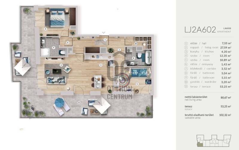 Erkély mérete: 53 m2