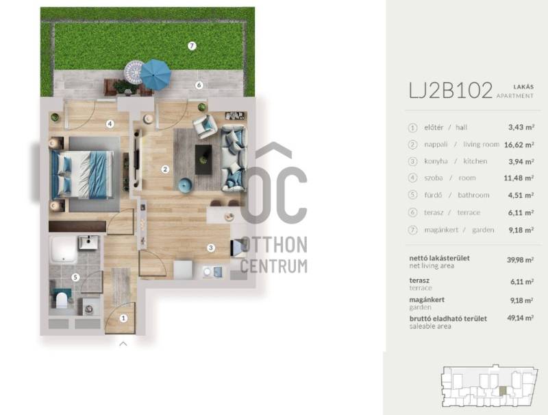 Projekt bemutatásaProjekt leírásA 147 lakásos My Garden 2 lakófejlesztés Budapest XIII. kerületének zöldövezeti részén, a Rákos-patak szomszédságában épül, ahol a modern élet és a természet harmóniája egyedülálló lakóélményt biztosít.A My Garden második ütem lakásai is magas szintű környezettudatosságot és kiemelkedő műszaki tartalmat képviselnek. Olyan fenntarthatósági megoldásokat alkalmazunk a lakóparkon, mint a megújuló energiaforrások, környezettudatos anyaghasználat, esővíz-újrahasznosítás, szelektív építési hulladékkezelés és felület hűtés-fűtés. A háromrétegű nyílászárók kiváló hő- és hangszigetelést biztosítanak, így a Le Jardin második ütemének lakásai alacsony fenntartási költségekkel és optimális komfortérzettel bírnak majd.A Váci úttól mindössze 10 percre található. A környék kifejezetten jó infrastruktúrával rendelkezik: oktatási intézményekben, bevásárlási lehetőségekben szociális-, sport- és egészségügyi létesítményekben bővelkedik a terület.A 6. emeleti penthouse lakásokból pazar kilátás nyílik a budai hegyekre, a kényelmet pedig biztosítja, hogy a nagy teraszon jacuzzi-nak kialakítható hely is található.A lakásokat átlagon felüli műszaki tartalom, energiahatékony- és gazdaságos üzemeltetés jellemzi.Környezettudatos beruházás, melynek részei a teljes mértékben- megújuló energián alapuló gépészeti megoldások,- a környezettudatos anyaghasználat,- a szelektív hulladékkezelés,- a környezettudatos vízfelhasználás,- az esővíz újrahasznosítása,- illetve a felület hűtés-fűtés.KÖZÖSSÉGI ELŐNYÖK:- közösségi nappali,- Business Corner,- közösségi BBQ hely,- fészer,- csomagpont.A fizetési ütemezés két részletben: 20% szerződéskötéskor és a fennmaradó 80% százalék a használatba vételi engedély kiadása után fizetendő a projektet finanszírozó bank felé.Átadás várható dátuma: 2027. II. negyedévTovábbi információért keressen bizalommal!