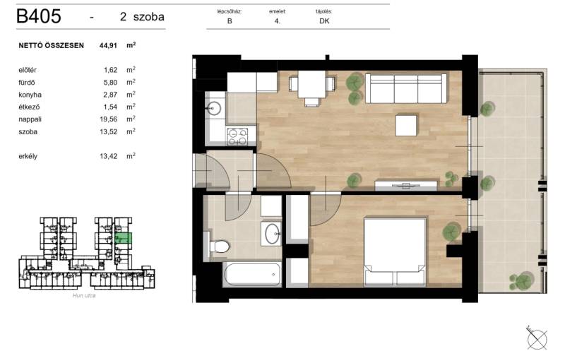 Kezdje az új évet ebben a minőségi, új építésű lakásban!Budapest XIII. kerületében a Hun utcában, új építésű társasházban eladásra kínálok negyedik emeleti, 45 nm-es lakást, 13 nm-es erkéllyel.A lakáshoz teremgarázs hely vásárolható 6.99MFt-ért.A kivitelező több mint 15 éve jelen van a piacon, és több mint 2.500 lakás kivitelezésében vett részt. Kiváló közlekedéssel, a belvárostól mindössze öt percre található.Bevásárlási és rekreációs lehetőségek a közelbenKiváló tömegközlekedésGazdaságos, fenntartható otthonokLegmodernebb hőszivattyús mennyezeti hűtés fűtés, alacsony rezsi!Egyedülálló belső zöld környezetVilágos életterekHangulatos belső térA Róbert Károly körút melletti beruházással elegáns, élhető otthonokat terveztek, fiataloknak, időseknek valamint akiknek fontos a városias de mégis zöld környezet.Részletekért, további információkért várom megtisztelő hívását! B405