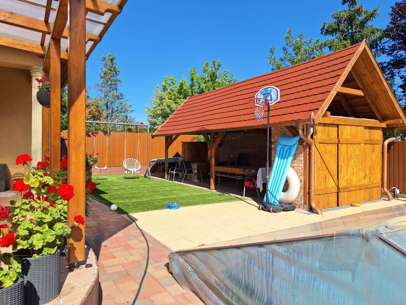 Ha olyan otthont keres, ahol a család minden tagja megtalálja a kényelmét, ahol a nyugalom és a praktikum egyszerre van jelen, akkor érdemes megismernie ezt a lehetőséget. A csendes kertvárosi környezetben, mégis a Lencztelep központjában található családi ház 2004-ben épült, bruttó 168 m²-es, nappalival, amerikai konyhával és négy külön nyíló szobával, amely tágas tereivel és átgondolt elrendezésével minden igényt kielégít. A házban két fürdőszoba, külön WC, háztartási helyiség és spájz szolgálja a mindennapi kényelmet, a fűtésről kondenzációs gázcirkó, padlófűtés, radiátorok és egy hangulatos cserépkályha gondoskodik, míg a műanyag nyílászárók, a hőszigetelt födém és a gondosan megépített falazat energiatakarékossá teszik az ingatlant. A garázsból közvetlenül a padlásfeljáró nyílik, emellett az udvarban további három autó kényelmes parkolása is biztosított.A 550 m²-es, gondosan parkosított telek igazi ékszerdoboz: a fedett teraszok, a beépített filagória, a bográcsozó és a kerti zuhanyzó tökéletes helyszínt kínálnak a családi és baráti összejövetelekhez, a saját gépészettel szerelt, fedhető 3x7 méteres medence pedig a nyári kikapcsolódás elengedhetetlen része. Az udvar műfűvel és térkővel borított, beépített tárolókkal praktikus megoldásokat nyújt, az automata öntözőrendszer pedig a virágok, évelő növények, vetemény és a termő barackfák gondozását könnyíti meg.Az elhelyezkedés szempontjából is ideális választás: mindössze néhány perc sétára található pékség, ABC, buszmegálló, iskola és játszótér, a közeli SZUSZ-park és a kerekestelepi fürdő pedig nagyszerű lehetőséget kínál a közös szabadidős programokhoz.Ez a ház azoknak a családoknak nyújt tökéletes otthont, akik a tágas, világos belső terek mellett értékelik a nyugodt környezetet, a modern kényelmet és a gondozott, élményekkel teli kert adta életérzést. Ne hagyja ki ezt a ritka lehetőséget, hiszen ez az ingatlan mindent megad, amire egy család hosszú távon vágyhat.