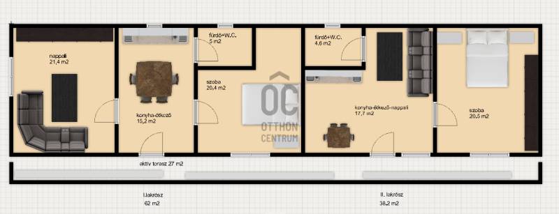 Örkény központjához közel kínálok megvételre egy két lakásból álló családi házat, mely igény szerint külön is megvásárolható vagy akár egybe is nyitható.Jelenleg a telek területe megosztás nélkül: 1823 m2.Össze hasznos alapterület: 100 m2I. lakás:62 m2- 2 szoba, konyha-étkező, fürdőszoba zuhanyzóval és W.C.-vel- egy szoba utca fronton helyezkedik el- 40 Mft irányáronII. lakás: 38 m2- 1 szoba, nappali-konyha-étkező, fürdőszoba zuhanyzóval és W.C.-vel- szoba a hátsó kertre néz- 25 Mft irányáron2020-ban teljes felújításon esett át az épület:- villanyhálózet cser, így H tarifás mérőóra került kialakításra- hűtő-fűtő klímák- teljes tető felújítás- új vízvezetékek, ekkor készültek a fürdőszobák- ipari áram- 27 m2 aktív terasz- fa nyílászárók dupla hőszigetelt üveggel- vegyes falazat- fa födém szerkezet, gipszkartonos burkolással- víz, villany, csatorna közművek bekötveEladó vállalja, ha külön kerül eladásra a két ingatlan, gondoskodik az ügyvédi megosztásról. Az első vevő választhatja ki mekkora telekre lenne szüksége, természetesen a szorgalmi utat biztosítva a hátsó lakó számára.Buszmegálló 5 perc sétára található, utca végén iskola, óvoda.M5 autópálya 5 perc autóval, így a főváros 35 perc alatt elérhető.Településen boltok, orvosi rendelő, gyógyszertár megtalálható.Megtekintés a hét bármely napján.