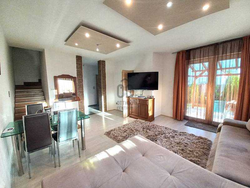 Debrecen Hatvan utcai kerti részén, gyönyörű, modern környezetben, nappali+ 3 hálószobás ikerház, gondozott kerttel eladó!Kiváló lokáció, kedvelt, sokak által előnyben részesített környezet.A belváros közelsége, illetve a nyugati városrész bevásárló üzleteinek rövid megközelíthetősége, és az autópálya gyors elérése is hatalmas előnyökkel jár az itt lakók számára.Aszfaltozott, átmenő forgalomtól mentes utcában található.Paraméterek:- 2017-ben téglából épült, szigetelt, garázzsal kapcsolatos, ikerház.- 125 nm alapterületű kétszintes, mediterrán jellegű épület- 16 nm-s garázs, elektromos kapuval ellátva- a földszinten: nappali - étkező, konyha, lépcső alatti tároló, és fördőszoba zuhanyzóval és WC- vel.- emeleti részén: 3 hálószoba, 1 fürdőszoba, 1 háztartási helyiség került kialakításra- műanyag, hőszigetelt nyílászárók- kondenzációs gáz cirkó kazán biztosítja a fűtést és a melegvíz ellátást.- padlófűtés a földszinten, radiátoros hőleadók az emeleti helyiségekben - a nappali közvetlen kapcsolatos a kellemes déli tájolású fedett terasszal- cc 150 nm -s parkosított, körbekerített kertben pihenheti ki a hétköznapok fáradalmaitTiszta tulajdoni viszonyok, hamar birtokba vehető otthon.Hívjon bizalommal, és nézze meg személyesen! Debrecen, Hatvan utca, kert, eladó, ház, iker, garázs,