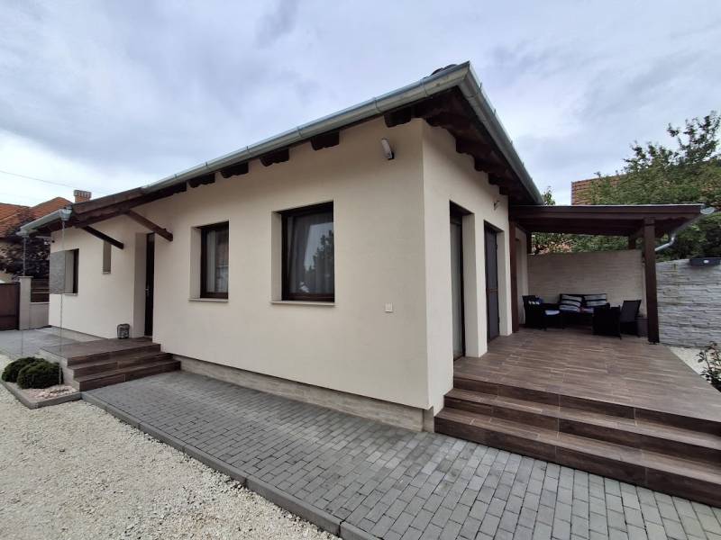 Eladó modern családi ház Cegléd kertvárosában – garázzsal és terasszalElhelyezkedés: Nyugodt, kertvárosi környezet Cegléden, kiváló választás családok számáraIngatlan főbb jellemzői:- Építés éve: 2021- Szerkezet: Porotherm 30-as tégla, 15 cm hungarocell szigeteléssel- Födém: fafödém- Hasznos alapterület: 80 nm- Helyiségek elosztása: Tágas nappali – konyha – étkező egy légtérben, 2 hálószoba- Terasz- Garázs- Parkosított udvar- Kondenzációs kazán padlófűtéssel- Műanyag, fa hatású nyílászárók- Elektromos redőnnyel és szúnyoghálóval felszerelve- Kiemelt előnyök:- Korszerű építés és szigetelés, alacsony rezsi- Modern, praktikus elrendezésA hirdetésben szereplő információk a megbízótól kapott adatok alapján készültek, pontosságukért felelősséget nem vállalunk! Irodánkban teljes körű ügyintézéssel, ingyenes , bankfüggetlen hiteltanácsadással várjuk!Amennyiben felkeltette érdeklődését a lakás, kérem, keressen bizalommal!