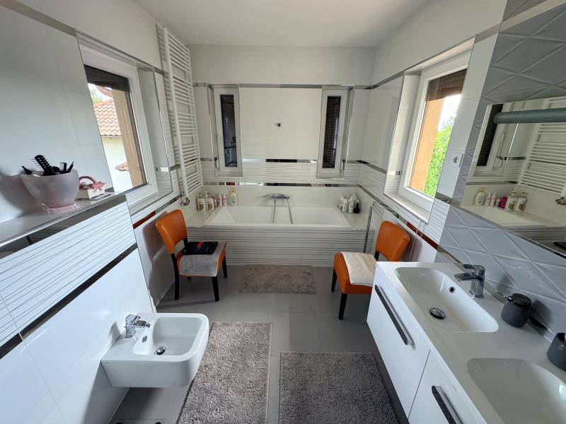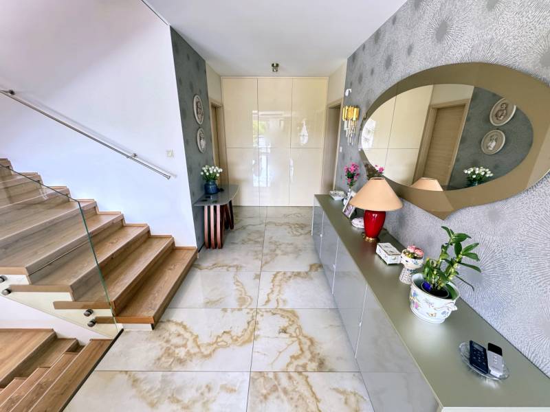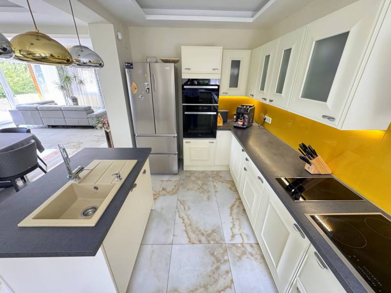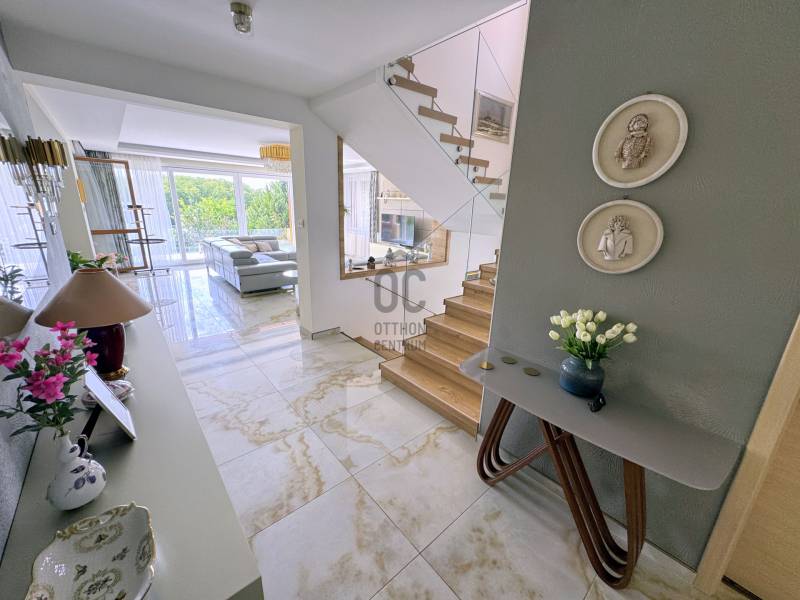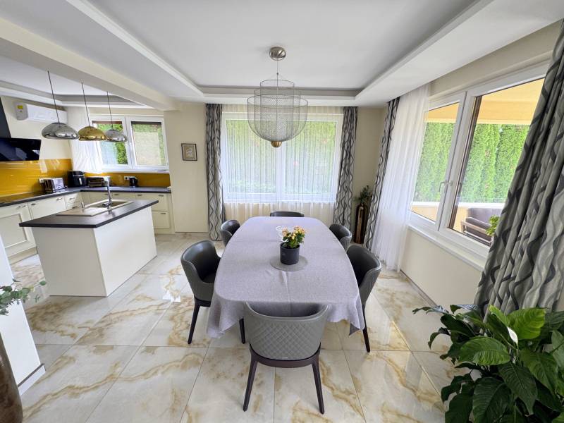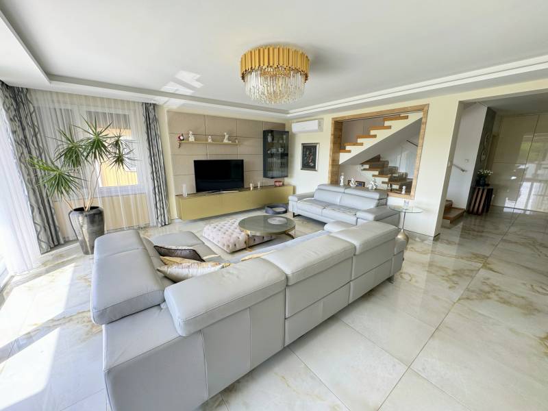 Gödöllőn eladóvá vált egy rendkívüli minőségben megépített 328nm-es, 7 szobás önálló családi ház 1200nm telekkel!A város központjához közeli Fenyves körzetben találod, impozáns környéken, ahol csak újszerű és űj építésű házakat találsz.Ez a prémium minőségű egyedi Otthon igazi ritkaság és csak olyanoknak ajánlom, akik a mediterrán stílusú meleg szineket kedvelik és a luxust.A három szinten mindent megtalálsz ami ahhoz kell, hogy kényelmesen, békében és biztonságban élhess családoddal.Akár az 5 hálószobáról, 4 fürdőszobáról vagy többi kiegészítő helyiségről legyen szó, itt mindenki megtalálja a számítását!+ A ház 2019-ben épült, 30-as Porotherm téglából, melyre 15cm szigetelés került. A födém teljes értékű, nagy teherbírású szigetelt beton födém, a padlástér tárolásra alkalmas és a tetősík is szigetelt.+ 10 kw-os napelem látja el a ház elektromos áram igényét, ez elegendő a teljes háztartás áramellátására, beleértve az elektromos autók töltését.+ A ház fűtését jelenleg gázkazán biztosítja, ám már megvásárlásra került egy új hőszivattyú, ami beszerelésre kész és a vételár részét képezi.+ A középső szinten padlófűtés van, a többi szinten radiátorok. Ezeket egészíti ki a fan-coil rendszerű hűtő-fűtő klíma minden helységben.+ Az alsó szinten kapott helyet egy nagy méretű háztartási helyiség és mosókonyha, egy kisebb, lépcső alatti tároló, egy közösségi tér, valamint egy további szoba saját fürdőszobával. Ezen túl még egy szauna és egy újabb fürdőszoba.+ A bejárati szinten lévő a két autó számára kényelmes, tágas garázsból az előszobába érkezünk, ahonnan egy vendégmosdó nyílik. Tovább haladva a ház többi részétől szeparált szoba található, mely remekül használható akár vendégszobaként vagy dolgozóként.+ Innen a tágas nappaliba juthatsz, ami mellett helyett kapott egy teljesen felszerelt szigettel is ellátott konyha-étkező. Ezen túl egy lenyűgöző kilátással ellátott erkély is növeli a komfort érzetet.+ A felső szinten három külön nyíló szoba erkély kapcsolattal, valamint két fürdőszoba található, egyikük közvetlenül az egyik hálószobából nyílik, így teljesen privát.További extrák: fürdésre alkalmas kerti tó, élménymedence, minden ablak szúnyoghálóval és redőnnyel felszerelt, riasztó rendszer, kapucsengő, központi porszívó, rengeteg beépített gardrób szekrény, autómata öntöző rendszer stb.Az ingatlan jogilag rendezett, akár hitelre is megvehető és akár 2-3 hónap alatt is költözhető. Bár az otthon start hitelre nem jogosult, hidd el sok extrái miatt megéri a piaci hitelt felvenni rá.Rengeteg érv szól e mellett a remek Otthon mellett, de inkább gyere el, nézd meg és szeress bele te is!