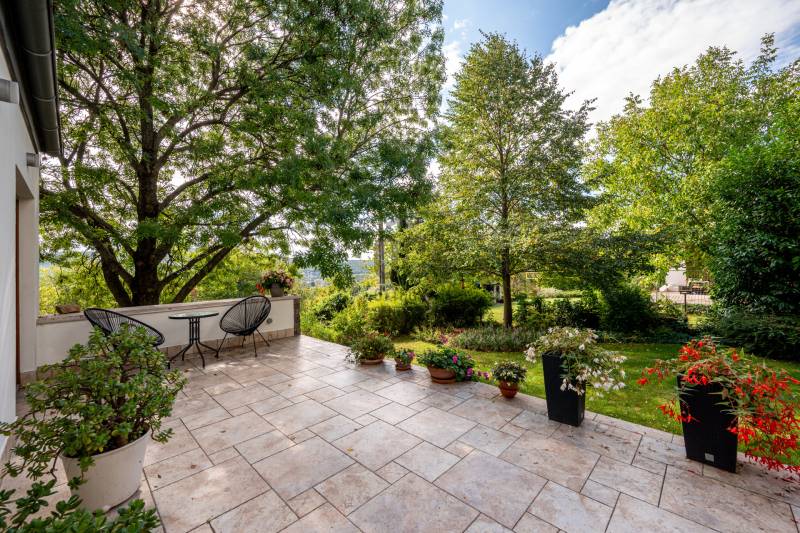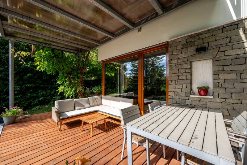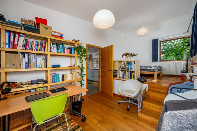 Lenyűgöző természetközeli luxus, ahol a design és a környezet tökéletes összhangot alkot!Nagykovácsi Cseresznyés részén áll ez a ház, melynek tervezésekor az volt a fő szempont, hogy a meglévő fák megmaradjanak – a végeredmény egy építészeti remekmű, ami körbeöleli az élő természetet. A fák árnyéka természetes hűtést és páratlan atmoszférát biztosít. A lehető legtöbb helyen hatalmas üvegfelületek engedik be a fényt és szinte elmossák a bel- és kültér közötti határokat. A ház egyik különleges építészeti megoldása a télikert, amely olyan érzetet nyújt, mintha közvetlenül a kertben sétálnánk.Mindezt a hatást fokozza a ház teraszairól elénk táruló csodás panoráma.Főbb paraméterek:- 237 m2 nettó alapterület- 2 lakószint + szuterénszinten a garázs- nappali + 4 szobaA szobák elosztása lehetővé teszi különböző generációk elkülönülését- 3 fürdőszoba + 2 kézmosós wc- fűtés: kondenzációs kazán, (szobákban radiátor, nappali-étkezőben padlófűtés), 3 db hűtő-fűtő split klíma, nappaliban cserépkályha- parkolás: 2 állásos garázs + nyitott beálló- 24 m2 fedett terasz- 11 m2 nyitott terasz- 17,8 m2 erkélyMűszaki paraméterek:- Porotherm 30 külső falazat+ 15 cm hőszigetelés- tető: VM-Zinc horganylemez- 3 rétegű fa nyílászárók - tölgy svédpadló padló- és lépcsőburkolatok- furnérozott tölgy belső ajtók- teraszok burkolata: kerámia, vörösfenyő, travertin mészkő- tetőn 5,3 kW-os napelemrendszer- automata öntözőrendszer- kerti csobogó- kerti tárolóAjánljuk 4-5 fős családoknak vagy nagyszülőkkel összeköltözőknek.Ha szeretné megtekinteni, várom hívását!