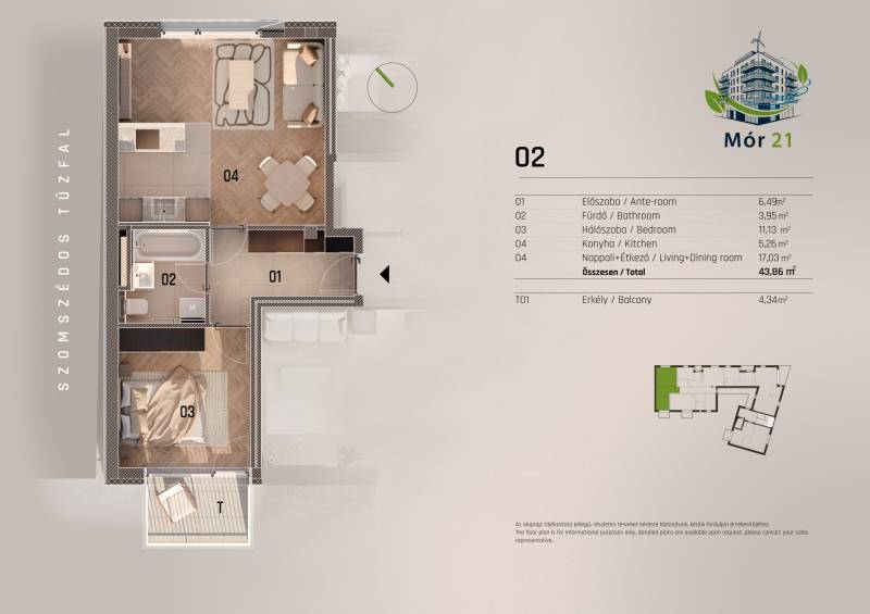 Projekt bemutatásaA Mór utca és Dévényi utca sarkán, egy hangulatos saroktelken épül fel ez a 23 lakásos, modern megjelenésű, mégis a környezetébe harmonikusan illeszkedő társasház. A kivitelezés során kiemelt figyelmet kapott a benapozás, a jól élhető terek kialakítása, valamint a magas műszaki tartalom.Az épület földszint + 5 emelet kialakítású, pinceszinttel, ahol teremgarázs és tárolók is helyet kaptak. Minden szinten ergonomikusan megtervezett, kiváló elosztású lakások találhatók, jellemzően 42–90 m² közötti alapterülettel. A legtöbb lakáshoz saját loggia, erkély vagy terasz tartozik – a felső szinten exkluzív nagy teraszos lakások kerültek kialakításra.A társasház minden szempontból megfelel a mai kor elvárásainak:– 23 parkolóhely (12 a pinceszinten, 11 a földszinten), Elektromos autó töltési lehetőséggel– 6 tároló,– zöldtető és közösségi tetőkert,– geotermikus hőszivattyús fűtés és hűtés,– padlófűtés, fan-coil hűtés,– háromrétegű nyílászárók, korszerű hő- és hangszigetelés,– liftes megközelítés minden szinten.Az épület anyaghasználata prémium minőségű: terrakotta árnyalatú burkolólapok, világosszürke betonhatású elemek és szignálfehér falfelületek teszik igazán különlegessé a házat.A kiváló infrastruktúrájú környék – Jász utca, Lehel út, Róbert Károly körút, M3-as közelsége – garantálja a gyors közlekedést, míg a környező parkok, új fejlesztések és szolgáltatások emelik a lakók életminőségét.Ez a projekt ideális választás lehet városi otthont keresőknek, tudatos befektetőknek és azoknak, akik értékelik a magas minőséget és az élhető, modern lakókörnyezetet.