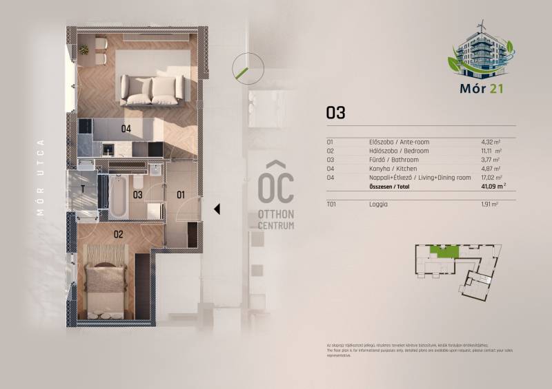 Projekt bemutatásaA Mór utca és Dévényi utca sarkán, egy hangulatos saroktelken épül fel ez a 23 lakásos, modern megjelenésű, mégis a környezetébe harmonikusan illeszkedő társasház. A kivitelezés során kiemelt figyelmet kapott a benapozás, a jól élhető terek kialakítása, valamint a magas műszaki tartalom.Az épület földszint + 5 emelet kialakítású, pinceszinttel, ahol teremgarázs és tárolók is helyet kaptak. Minden szinten ergonomikusan megtervezett, kiváló elosztású lakások találhatók, jellemzően 42–90 m² közötti alapterülettel. A legtöbb lakáshoz saját loggia, erkély vagy terasz tartozik – a felső szinten exkluzív nagy teraszos lakások kerültek kialakításra.A társasház minden szempontból megfelel a mai kor elvárásainak:– 23 parkolóhely (12 a pinceszinten, 11 a földszinten), Elektromos autó töltési lehetőséggel– 6 tároló,– zöldtető és közösségi tetőkert,– geotermikus hőszivattyús fűtés és hűtés,– padlófűtés, fan-coil hűtés,– háromrétegű nyílászárók, korszerű hő- és hangszigetelés,– liftes megközelítés minden szinten.Az épület anyaghasználata prémium minőségű: terrakotta árnyalatú burkolólapok, világosszürke betonhatású elemek és szignálfehér falfelületek teszik igazán különlegessé a házat.A kiváló infrastruktúrájú környék – Jász utca, Lehel út, Róbert Károly körút, M3-as közelsége – garantálja a gyors közlekedést, míg a környező parkok, új fejlesztések és szolgáltatások emelik a lakók életminőségét.Ez a projekt ideális választás lehet városi otthont keresőknek, tudatos befektetőknek és azoknak, akik értékelik a magas minőséget és az élhető, modern lakókörnyezetet.