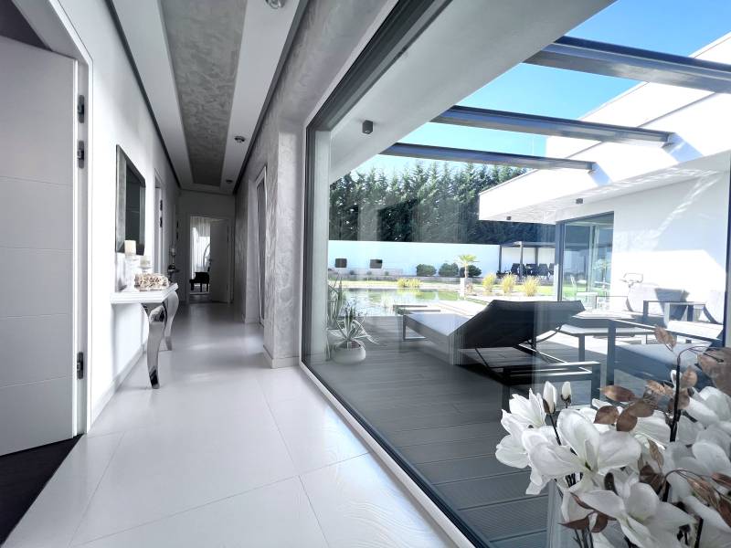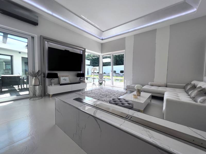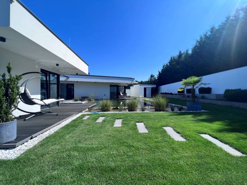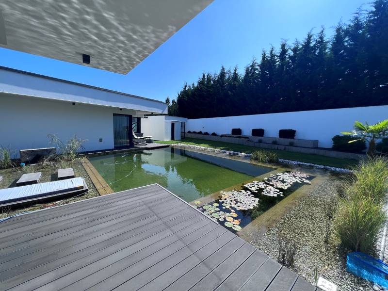 Megvételre kínálunk, egy újszerű, kompromisszummentes, kiváló adottságokkal rendelkező, egyszintes, minimalista jegyekkel épült, 220 nm- alapterületű, nappali+3 hálószobás modern családi házat kétállásos garázzsal.A Lake Forest villaparkot egy Magyarországon egyedülálló vízió hozta létre, mégpedig egy erdő közepén elterülő letisztult és mintaszerű Modern családi házas környezet, a Villapark közepén kialakított 7000 nm-es dísztóval.A ház gondosan megtervezett, mind külső jegyei, mind a belső enteriőr vonzza a tekintetet. Prémium minőségű, építészeti megoldások mellett, magas műszaki tartalommal épült, a praktikum és az elegancia ihlette.A házról:A házba lépve már az előtérben szemet gyönyörködtető, az üveg felületeknek köszönhetően elénk táruló, a házat körülvevő privát kert és Bio tó. Az előtérből jobbra található az Amerikai konyhás nappali, szintén körbe üveg felülettel, egyedi gyártású, teljesen gépesített, prémium minőségű konyhabútorral. Az étkezőasztal mögött kapott helyet egy Bioetanol beépített látványkandalló is, ami szeparálja a pihenő nappalit, a páratlan, saját tóra és teraszra tájolva. A nappali a hálószobáktól teljesen elkülönül, a gondos tervezésnek köszönhetően.Az előtértől balra a közlekedőn át található egy vendég wc, tovább a gardrób szoba, melyből nyílik egy tágas kádas, ablakos fürdőszoba wc-vel. A közlekedőn át haladva az üvegfelületeken át az egész kert és a tó is elénk tárul, miközben elérjük a két külön nyíló gyermekszobát, továbbá a mosókonyhát. A gyermekszobák és a szülői háló között található a dolgozószoba, majd a szülői háló, saját gardróbbal, privát terasszal és fürdőszobával. Minden szobája kertkapcsolatos, a kert intimitása teret ad az aktív pihenésnek, mindezeken túl tetőterasz is kialakításra került.Komfort:A házban a 2 fürdőszobán túl további vendég wc és zuhany is kialakításra került.Műszaki tartalom:A ház falazata, 30 cm-es Porotherm falazat amely 20 cm-es Austrotherm Grafit fokozott hőszigeteléssel lett ellátva. A ház építése során a munkafolyamatok dokumentálva lettek, bővebb műszaki tájékoztatással személyesen állunk szíves rendelkezésükre.A gépészet:A fűtés padló és falfűtéssel lett kialakítva, a helyiségekben inverteles klíma berendezések biztosítják a hűtést-fűtést, a ház központi vízlágyító és víztisztító rendszerrel lett kiépítve. 10.5 kw teljesítményű napelem rendszer biztosítja a ház energiatakarékos fenntartását.Luxus kategóriájú Olasz hideg burkolatok kerültek beépítésre a fürdőszobákban és a közlekedőn, valamint a nappaliban. A szobákban egyedi színre pácolt tölgyfa parketta került, prémium szaniterekkel, csaptelepekkel, egyedi gyártású nyílászárókkal.Kert :A hatalmas Telek, lehetőséget nyújtott egy csodás privát kert, kényelmes terasz modern WPC burkolattal, saját BIO tó, grill terasz bioklimatikus motoros, vízálló pergolával (mely körbe LED világítással van felszerelve), a házhoz kapcsolódó tároló épület, kialakítására. A telek V-alakú formájából adódóan a hátsó kert tágas, egyedi méretének köszönhetően kellően nyugodt magánszférát és intimitást nyújt az otthon eltöltött pihenésnél. Mára a zöld növényzet a dísznövények, a kert összképe magával ragadó, a Leendő Tulajdonosnak már csak a fenntartására kell energiát fordítania.A kert fenntartáshoz szükséges ROBOMOW önjáró fűnyíró és a Bio tó tisztításához szükséges DOLPHIN medence tisztító is a vételár részét képezik.Berendezés:Szinte a teljes berendezésre, bútorzatra a leendő tulajdonos igényt tarthat, már csak élveznie kell az új Otthona kényelmét.További felmerülő kérdéseivel forduljon hozzám bizalommal, megtekintés rugalmasan, előre egyeztetett időpontban.Ferge Imre