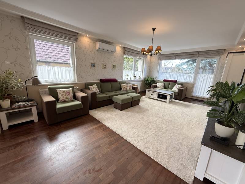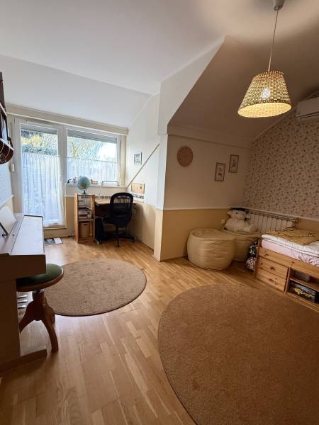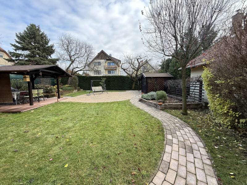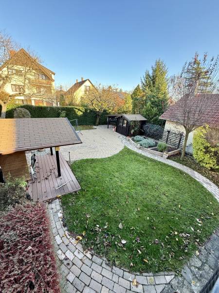 Különleges lehetőség, egy igazán otthonos ház várja Önt Budaörs csendes, kertvárosi részén.Az utcán sétálva nem is gondolná a kedves érdeklődő micsoda kincset rejt a kerítés. Az alsó szintjén található egy közvetlen kertkapcsolatos, nappali és egy hálószobás kialakítású lakás tágas étkezővel, konyhával, fürdőszobával és egy tároló helyiséggel. Külső lépcsőn jutunk fel a felső, belső kétszintes, átgondolt kialakítású, teraszos lakrészbe. Itt egy nagy ablakos étkezőbe érkezünk, a hatalmas nappali mindig fényárban úszik. A konyha a lakás sarkában található, kamrával, kicsit szeparáltan a többi helyiségtől, így mind az amerikai konyha, mind a zárt konyha előnyét élvezheti a tulajdonosa. Ezen a szinten még egy fürdőszoba és egy dolgozószoba található. Belső lépcsőn jutunk fel a felső szintre, ahol 3 hálószoba, egy fürdőszoba lett kialakítva. Erkélyek, teraszok minden szinten kapcsolódnak szobákhoz.Ez a kitűnő állapotú, szuper beosztású, hangulatos, kétgenerációs családiház sok lehetőséget rejt. A házban összesen hét szoba található, így bőséges hely áll rendelkezésre a család minden tagja számára, legyen szó akár gyerekszobákról, dolgozószobáról vagy vendégszobáról. A három fürdőszoba pedig garantálja, hogy a reggeli rohanás során senkinek ne kelljen várakoznia. A gázfűtés és a klímaberendezés biztosítja a megfelelő hőmérsékletet egész évben. A ház kertje varázslatos, intim, praktikus terekkel, szaletlivel, tárolóval, mely tökéletes helyszínt nyújt a szabadidős tevékenységekhez, családi összejövetelekhez. A házhoz elektromos autó töltési lehetőség is tartozik, amely a modern kor igényeit szolgálja ki. Ez a kétgenerációs ház tökéletes választás összeköltözőknek, önállósodóknak, otthon dolgozóknak, vállalkozóknak egyaránt.Méretét tekintve pont jó azt gondolom mindenkinek, nem hatalmas, mégis tágas, a kertje sem óriás, de remekül elfér benne minden (akár egy medence is ), ideális annak, aki Budapesthez közel, zöld övezetben, csendes környezetben képzeli el új otthonát! Budaörs nemcsak a zöld környezetéről, hanem kitűnő közlekedési lehetőségeiről is híres. Az ingatlan könnyen megközelíthető autóval, a közeli főutaknak köszönhetően, de a tömegközlekedés is jól kiépített, így a főváros gyorsan elérhető. A csendes környék biztonságos, ideális helyszín a gyerekek számára, ahol szabadon játszhatnak, felfedezhetik a természetet. A környék számos előnnyel rendelkezik, hiszen a közelben található iskolák, óvodák és bevásárlási lehetőségek is, így mindennapi szükségletei könnyen kielégíthetők. A zöld területek, parkok és játszóterek pedig remek lehetőséget biztosítanak a szabadidő eltöltésére, legyen szó akár sétáról, kerékpározásról vagy piknikezésről.