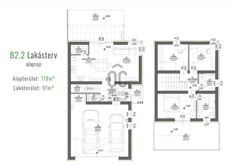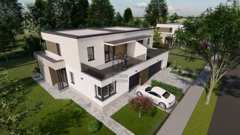 Képzeljen el egy otthont, ahol a modern építészet és a természet harmóniája találkozik. Debrecen-Józsa legújabb lakóparkja különlegessége, hogy a terület korábban botanikus kertként működött, ennek varázslatos hangulata ma is átjárja a környéket. A gazdag növényzet és a gondosan parkosított környezet biztosítja a természet közelségét és a mindennapok nyugalmát.A lakópark csendes utcáiban a gyerekek biztonságosan játszhatnak, biciklizhetnek, miközben a család a zöld környezet nyugalmát élvezheti.Alapterület: 178 m²Lakótér: 91 m²Szintek: földszint + emeletSzobák száma: 3 szoba + nappaliGarázs: két autónak, közvetlen belső kapcsolattalTelekrész: 450 nmElrendezés- A modern, lapostetős ikerház átgondolt alaprajzzal rendelkezik:- Földszint: világos nappali étkező-konyhával és kamrával, egy hálószoba, fürdőszoba, külön WC, háztartási helyiség, előszoba, kétállásos garázs, valamint tágas terasz.- Emelet: további két hálószoba, két fürdőszoba, közlekedő, és nagy erkély.Műszaki tartalom (kiemelt jellemzők)- Szerkezet: Porotherm 30 N+F tégla, 15–20 cm hőszigeteléssel- Tetőszerkezet: lapostető, egyenes rétegrenddel, kavicsolt felülettel- Nyílászárók: 6 légkamrás, 3 rétegű üvegezéssel (Uw=0,9 W/m²K), kívül antracit, belül fehér- Árnyékolás: motoros redőny előkészítés- Garázskapu: motoros, hőszigetelt szekcionált kapu, 2 távirányítóval- Burkolatok: laminált padló 7.500 Ft/m²-ig, kerámia 10.000 Ft/m²-ig választható- Fürdőszoba felszereltség: Hansgrohe csaptelepek, Wellis szaniterek, Macryl Eco kád, Ravak zuhanyfal- Fűtés-hűtés: levegő-víz hőszivattyú, padlófűtés + mennyezethűtés, nappaliban klíma- Szellőzés: hővisszanyerős szellőztető rendszer- Biztonság: komplett riasztórendszer előkészítveExtrák- Körbekerített lakópark, úszókapuval, kizárólag lakók részére- Biztonságos magánutca, ahol a gyerekek felszabadultan játszhatnak- Tágas terasz és erkély, ideális családi és baráti összejövetelekhez- Új építésű, energiatakarékos otthon modern gépészettel- Egyedülálló zöld környezet a volt botanikus kert helyénHa Ön is egy modern, energiatakarékos otthonra vágyik a természet ölelésében, biztonságos, családbarát környezetben, ne habozzon!Hívjon most, és biztosítsa be helyét Debrecen-Józsa legújabb lakóparkjának különleges otthonai között.MAGASTETŐS KIVITELBEN IS VÁLASZTHATÓ: 196.900.000 HUF.