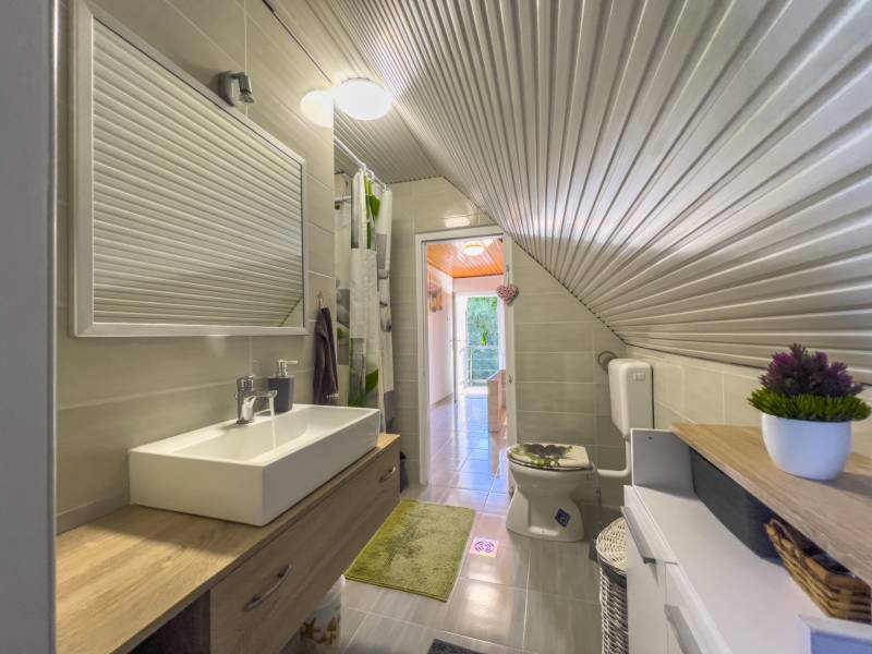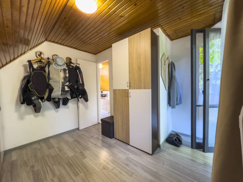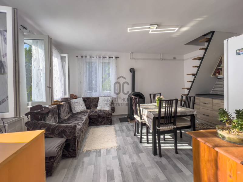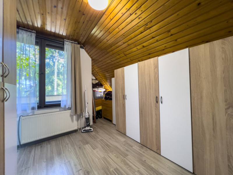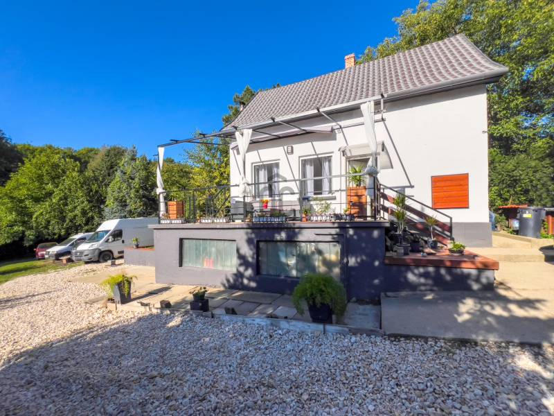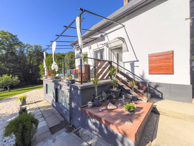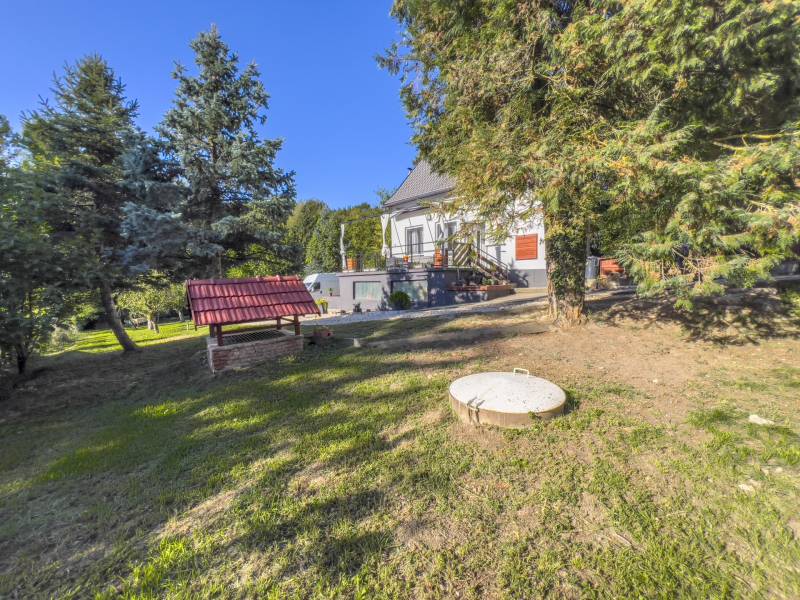 A telek végében ősfás erdő, kertben gyümölcsfák vannak.Ház alatt garázs ás tároló található..A házban található:Földszint: