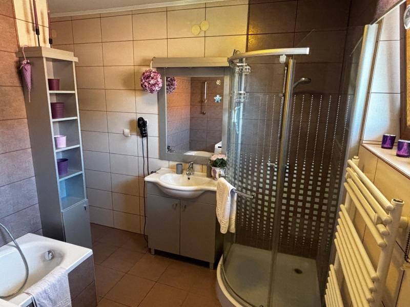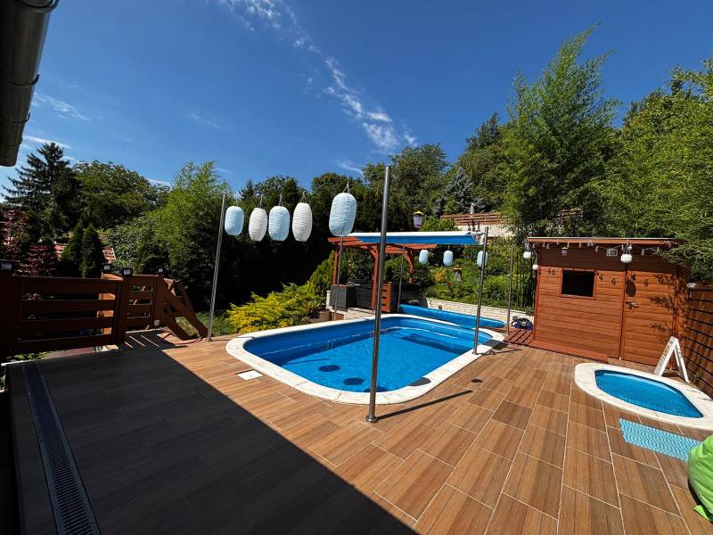 Luxus családi ház a dunakanyarban, akár 2 generációnak is, rövidtávú bérbeadás esetén 7 éves megtérüléssel, hatósági engedéllyekkel, (KTSZ, NTAK, ÁNTSZ, NÉBIH) további fejlesztési lehetőségekkel komoly vállalkozással, pályázatra alkalmas 16 éves céggel, akár 3% 100 milliós hitelfelvételi lehetőséggel, magas foglaltsággal eladó!Itt található a régió legmagasabb felszereltségű wellness terasza és egyediként kínál, nagyméretű engedélyezett gépészettel rendelkező fűthető, nyitott úszómedencét.Pilismaróton minden kényelemmel felszerelt, minőségi anyagokból 2015-ben épült, két szintes, nettó lhasznos 420 m² összbeépített ház, medencével, jakuzzival, szaunával. A két vendég lakás egy szinten található, mely külön bejárattal rendelkezik, de egybe is nyitható.Az alsó szint 200 m², több helyiséggel (volt sütődei tevékenységgel) jelenleg üres állapotban, 2 fürdő, 2 wc, 2 konyha felszereltséggel.A több célú hasznosíthatóságra minden lehetőség adott!Kiválóan alkalmas a vállalkozás továbbfejlesztésére, turisztikai céllal a vendégház bővítésére, szabadidős tevékenység, wellness, vagy újabb lakóegység kialakítására! Teljesen külön bekötött ipari közművekkel műhely és/vagy ipari tevékenység folytatására.Műszaki tartalom:-Teljesen külön bekötött ipari közművekkel műhely és/vagy ipari tevékenység folytatására.-Víz, csatorna, villany: 3x35 A, gáz: ipari 26 m³ és háztartási 6 m³ órával.- 18,5 kW teljesítményű napelem került felszerelésre, mely a teljes villanyfogyasztást fedezi, a szaunával, jakuzzival, medencével együtt is!-A helyiségek klimatizáltak, radiátoros-, és padlófűtéssel (gáz cirkó), szunyoghálóval, riasztóval ellátottak. Az egyik nappaliban hangulatos téglahályha is melegít. Az egész ház kívülről szigetelve, a padlástér szintén szigetelt, hasznos 80 m² beépíthetőséggel.-Távirányítós tolókapu.-Zárt, fedett villany-, gázfogadó és kukatároló.-Az egész ház rögzítős kamera rendszerrel ellátott. Riasztó rendszere őrző-védő céghez bekötve.-Internet ( wifi az egész házban), műholdas televízió.-Térburkolat: 52,5 m² 5-6 gépkocsi részére beálló kialakítva-A házból nyílik a 70 m²-es, fedett terasz, gyönyörű fagerendás tetővel és a 60 m²-es wellness terasz: 18 m³-es fűthető medencével, 6 személyes jakuzzival és a szauna csobbanó medencével.-A terasz alatt 2 helyiséges, polcrendszerrel beépített, klímával felszerelt, vizes blokkal is rendelkező pince-tároló.-A nagyméretű, karbantartott mediterrán kertben kiépített locsolórendszer, gyerekjátszó, valamint 2 helyiségből álló műhely és tároló épült. Ennek füvesített tetején egy tűzrakó hely, a pilisi hegyek látványával.-A telek legmagasabb pontján dunakanyari panorámával 4 m-es épített kilátó áll.