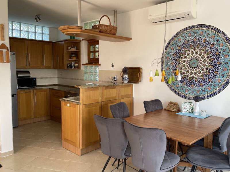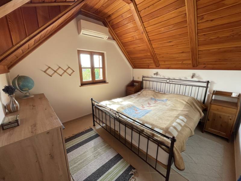 Panorámás szőlőhegyi ház Balatonfüreden – borospince, terasz, nagy telek!Balatonfüred csendes szőlőhegyi részén, 1868 m²-es telken eladó egy 158 m²-es kitűnő állapotú, igényes, Tihanyra néző panorámás ház téglaboltozatos borospincével, tágas terasszal, modern gépészettel és gondozott szőlővel. Az ingatlan Balaton-felvidék hagyományos stílusát és a kortárs építészet kifinomultságát ötvözi.Természetes, nemes anyagokból, helyi mesterek munkájával készült, így minden részlete a minőséget és tartósságot tükrözi.A ház a Balatonra nyíló panorámával és a természet nyugalmával ajándékoz meg, miközben Balatonfüred pezsgő élete néhány perc alatt elérhető.Főbb adatokHelyszín: Balatonfüred, szőlő besorolású telekTelek mérete: 1868 m² (gondozott szőlővel, díszkerttel, csúszdás mászókával, tágas parkolóval)Épület bruttó alapterülete: 158 m²Pince + földszint + tetőtér + borospince padlófűtés, extra radiátorok, sütőfunkciós cserépkályha, napkollektor – energiatakarékos kivitelPanorámás elhelyezkedés, természetvédelmi övezet mellettAz épületL-alakú, több szinten kialakított ház, tető- és homlokzatszigeteléssel, kettős hódfarkú betoncseréppel fedveTeljes alápincézés: tárolóhelyiség, infraszaunás, padlófűtéses fürdőhelyiség, gépészeti helyiségBorospince: földdel fedett téglaboltozatos, külön szellőzőkkel, tölgyfa ajtókkal, felülvilágítássalFöldszint: nappali + étkező (19,8 m²) + konyha (7,2 m² ) légtérben split klímával, vendégszoba (8,9 m²) + zuhanyzós fürdő (2,4 m²)Emelet: 2 hálószoba (20 és 10,2 m²) split klímákkal, sarokkádas fürdő (4,1 m²), külön WC (1,6 m²), tárolóKiegészítők: cserépkályha, infraszauna, félköríves terasz (25 m²), melynek burkolata felújításra szorul, így lehetőséget biztosítva a további egyéni igények kialakítására.Felszereltség és extrákViessmann gépészet: a tetőn elhelyezett napcellákkal a 705 l szünetmentes tápegységgel kiegészített puffertároló egész nyáron melegvizet, télen fűtésrásegítés funkciót biztosít.Fűtés: a föld alatti 5 m3-es propángáz tartály biztosítja a padlófűtést minden szinten, a nappaliban cserépkályha sütőfunkcióval, split klímák, a fürdőkben plusz törölközőszárító radiátorok.Nyílászárók: spalettás hőszigetelt tölgyfaablakok, mozgás-nyitásérzékelő riasztórendszerrel, kamerákkal.Szennyvíz: földalatti zárt szippantós.Kapcsolatok: meglévő UPC tányér és bevezetett telefonkábel, WIFI Extra: cserépkályha és infraszauna.Kert és telekTérkövezett parkoló, akár 5-6 autó részére1868 m² telek, melynek 80%-a gondozott szőlő (rizling, muskotály, csemegeszőlők)Vadkerítés, elektromos úszókapu, nagy parkoló világítássalCsepegtetőrendszer a díszkerthez, a szőlőben mozgásérzékelő reflektorok Játszótér: fa mászóka, csúszda, dupla hintaKerti tároló.ÁllapotÚjszerű, megkímélt állapotFolyamatosan karbantartvaEz az ingatlan tökéletes választás mindazoknak, akik Balatonfüreden keresnek nyugodt, panorámás környezetben épült, hivatalosan és szabályosan megépített gazdasági épületet, pince- és borospince-kapcsolattal, teljes infrastruktúrával, energiatakarékos gépészettel.