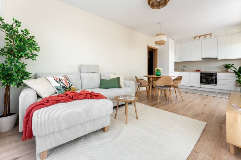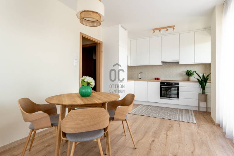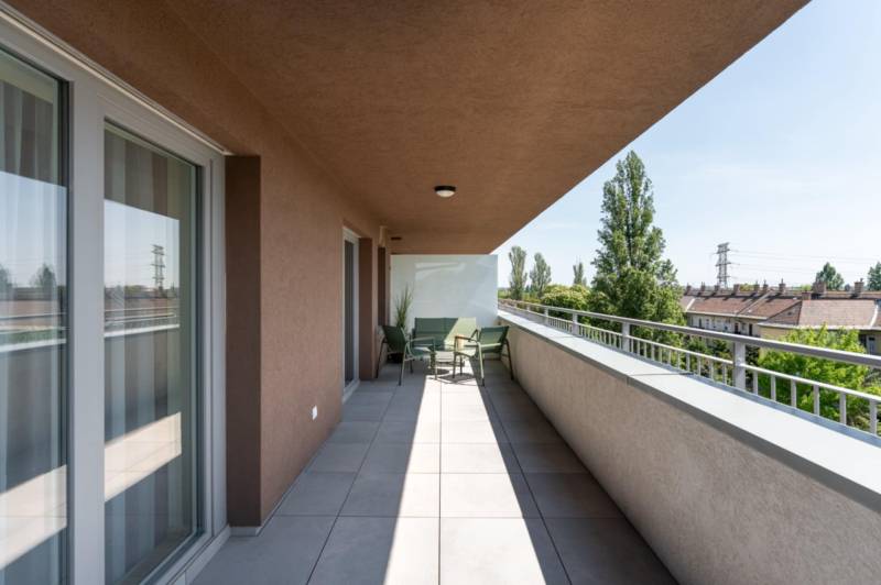 !! IGAZI RITKASÁG, KIVÉTELES LEHETŐSÉG !!!A XIII. kerület családias részén, a New Palace lakóparkban várja első lakóját ez a nagy teraszos, TELJESEN BERENDEZETT otthon.Az épület nemrég került átadásra, ennek megfelelően a mai igényeknek, elvárásoknak eleget tesz: többek között a mennyezeti hűtés-fűtés, gyönyörű füvezett közös kert, praktikus alaprajz teszik szerethetővé és igazán élhetővé.A lakás 4. emeleti saroklakás, 65 nm, 27 nm-es L alakú terasszal, nappalival, 2 hálóval, gardróbbal.Tájolásának köszönhetően valahol mindig élvezhetjük a Nap sugaraitA lakáshoz tartozik egy nagy méretű parkoló és tároló, melyek megvásárlása kötelező.