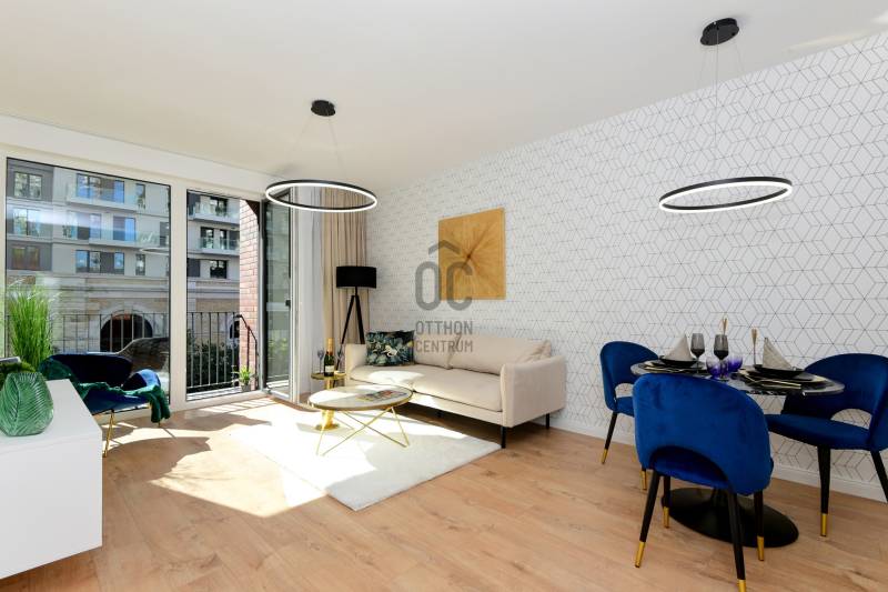 AZONNAL KÖLTÖZHETŐ új építésű 2 szobás erkélyes lakás a IX. kerület Millenniumi városközpontnál.A FÉNYKÉPEK A VALÓSÁGOT ÁBRÁZOLJÁK, NEM LÁTVÁNYTERVEK!Az épület idén nyáron készült el, kiváló minőségben épült.Portaszolgálat, szauna, konditerem, napozóterasz, sószoba, elektromos autóstöltő.Az A+ energetikai besorolású ingatlanok mennyezeti hűtés-fűtéssel rendelkeznek, okos otthon rendszerrel felszereltek.A lakás klimatizált, a hatalmas üvegfelületeken árad be a napfény, nyugati tájolású.A konyhabútor matt fehér és matt fekete színei modern és elegáns megjelenést adnak, teljesen gépesített, indukciós főzőlap, sütő, mosogatógép, beépített hűtő, mikró.Az ingatlan ízlésesen berendezett, a lakáshoz bérelhető elektromos töltővel szerelt teremgarázs hely.A társasház Budapest IX. kerületének Millenniumi Városközpontjában, a Vaskapu és a Vágóhíd utca sarkán fekszik, közel a Nemzeti Színházhoz és a Művészetek Palotájához, számos irodaház, üzlet, iskola és egyetem közelében.A lakóparkban 24 órás portaszolgálat működik. A fogadóhelyiségben pedig csomagpont szolgálja a lakók még nagyobb kényelmét, szolgáltatásai a közlekedést is megkönnyítik: mikromobilitási pont, GreenGo és Bubi állomás, valamint fedett kerékpártároló is rendelkezésre áll, a mélygarázsban pedig valamennyi beállóhoz elektromosautó -töltőállomás tartozik.Pár perc sétára található az 1-es villamos megállója, amely a Kelenföldi pályaudvartól az Infoparkon és a Városligeten keresztül Óbudáig jár, valamint a 2-es és 3-as metró megállóit is érinti. Szinén a közelben jár a 2-es villamos, ami amellett, hogy Európa egyik legszebb villamosvonala a Duna-parti nyomvonalának köszönhetően, de megközelíthető vele a pesti belváros és a Nagykörút északi része, a 24-es villamossal pedig a Keleti pályaudvarhoz lehet eljutni átszállás nélkül. Éjszaka a 901-es és a 908-as buszokkal lehet hazajutni.Több ezer telepített növénynek köszönhetően nevezhető zöldnek: környezetbarát és energiatakarékos megoldásai az energiaköltségek, illetve az ökológiai lábnyom jelentős csökkentését is lehetővé teszik.Az alacsonyabb épületek zöldtetőt kaptak, ami amellett, hogy kellemes közérzetet biztosít és nyáron csökkenti a városi hősziget kialakulását, hőszigetelő funkciót is ellát. A magasabb épületeken pedig a napelemek kaptak helyet, amelyek elektromos energiával látják el a lakóparkot.A kényelmet és az energiahatékonyságot támogatja a lakópark saját, harmadik generációs okosotthon-rendszere is, amely állandó beavatkozás igénye nélkül vezérli a lakások elektromos rendszerét, hűtés-fűtését és árnyékolását.
