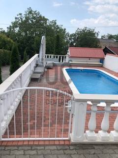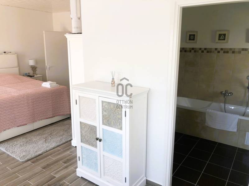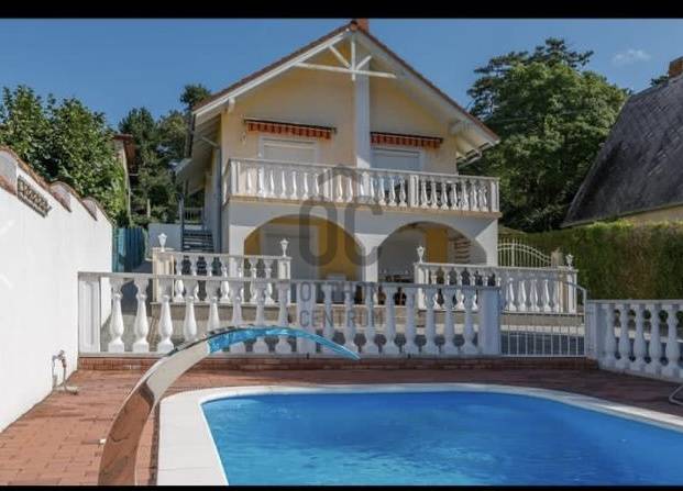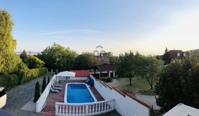 A BALATON ÉSZAKI PARTJÁN, VONYARCVASHEGYEN CSENDES KÖRNYÉKEN, NYUGODT KÖRNYEZETBEN ELADÓ PANORÁMÁS, TÖBB FUNKCIÓS CSALÁDI HÁZ ÚSZÓMEDENCÉVEL. AZ OTTHON CENTRUM KIEMELT AJÁNLATA.Az ingatlant biztonságos, kedvelt kicsi zsákutcában találjuk. Pontosan illik rá a település szlogenje: \" Mögöttünk az erdő, előttünk a víz.\" A telek 714 m2, nagyrész térkövezett, könnyen karbantartható. A ház két szintes, hatalmas terasszal, erkéllyel, ahonnan a Balaton tükrében is gyönyörködhetünk. Megbízható minőségben épült 2003-ban, néhány éve modernizálták, alakítottak a használati beosztáson.További jellemzői: - Összközműves tégla épület, cserép fedéssel. Műanyag nyílászárók. - Gáz cirkó fűtés, + két hangulatos kandalló -4 hálószoba, 3 fürdőszoba nagyobb családnak is kényelmes elhelyezést biztosít. - A nettó lakótér 120 m2, ami nem foglalja magában a teraszokat, erkélyt, tárolókat. - Helyiségek: A földszinten teraszkapcsolatos nappali, egy légterű, de szaperált modern konyhával, étkezővel. Kis közlekedőből nyílik egy fürdő, tágas hálószoba és a lépcsőfeljáró. A felső szintre belül, és külső lépcsön is fel lehet jutni. Itt három hálószobát, zuhanyzós és kádas fürdőszobaát alakítottak ki. A déli tájolású legnagyobb hálóból panoráma erkély nyílik. A ház mögött két méretes tároló, elektromos távirányítós záróredőnyokkel. Elektromosan vezérelt kapu. Mivel a két szint külön bejárattal is rendelkezik, két generáció lakhatására, nyaralására, kiadásra is alkalmassá tehetó. Befektetésnek szintén kiváló ajánlat.A ház teljes berendezéssel. felszereléssel kerül értékesítésre, amit a vételár tartalmaz. Vonyarcvashegyet a Keszthelyi-hegység öleli körül, erdőivel, szőlőültetvényeivel, árnyas pincéivel, benne sajátos ízvilágú boraival. Ötcsillagos Lido strandja számos alkalommal érte el a Balaton legszebb, legsportosabb strandja kitüntető elismerést. A környék jellegzetessége a Csándor-hegy tetején álló Kálvária út és a végén a 2010-ben felszentelt 7,38 méter magas Fénykereszt. A Balatonból kiemelkedő egykori dombsziget, a 136 méter magas Szent Mihály domb. Tetején áll a 40 jéghalász megmenekülése emlékét őrző Szent Mihály Fogadalmi Halászkápolna, mely Magyarország, sőt a tengerparttal nem rendelkező országok egyetlen Halászkápolnája. Ez a csodás fekvésű, romantikus hangulatú szakrális hely megigézi az idelátogatókat. A hosszú évszázadok múltját őrző kápolna Vonyarcvashegy jelképévé vált.Ha felkeltette érdeklődését a fenti ingatlan, további kérdései vannak, megtekintéshez időpontot egyeztetne, kérem, hívjon, írjon a megadott elérhetőségeken.