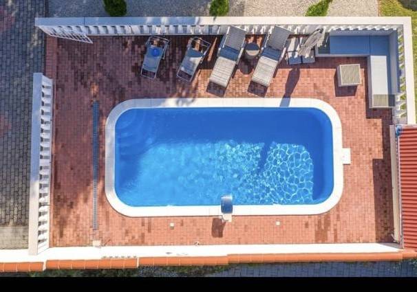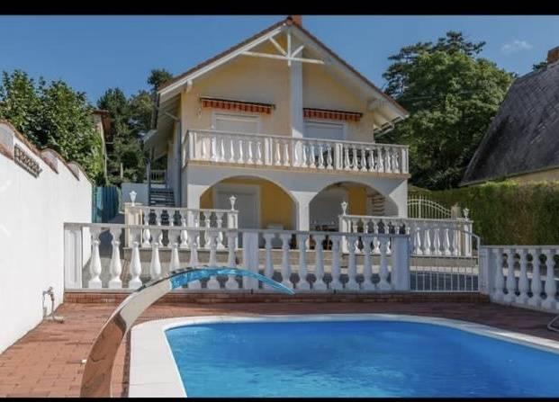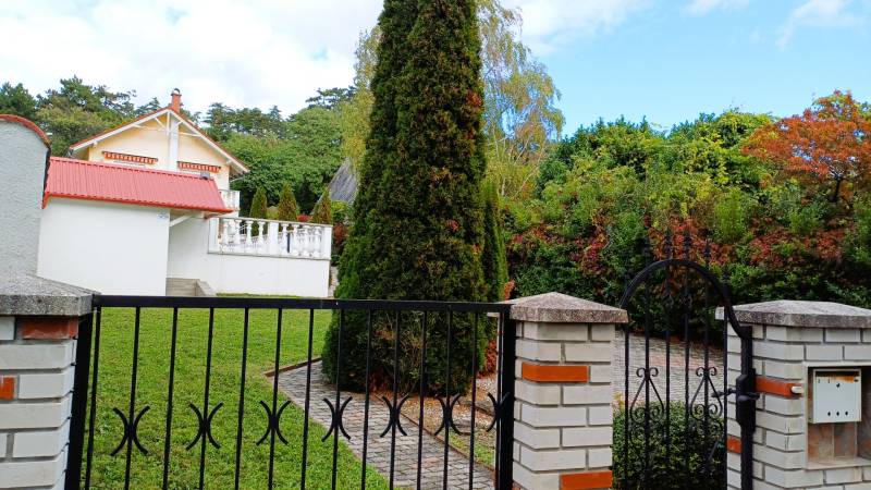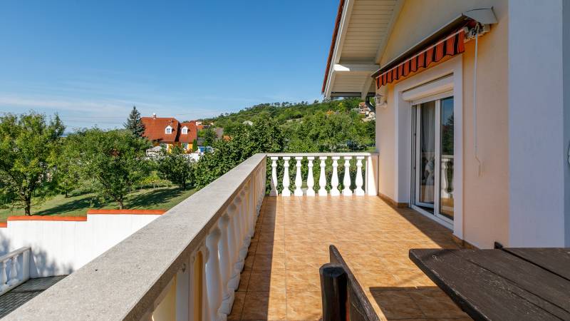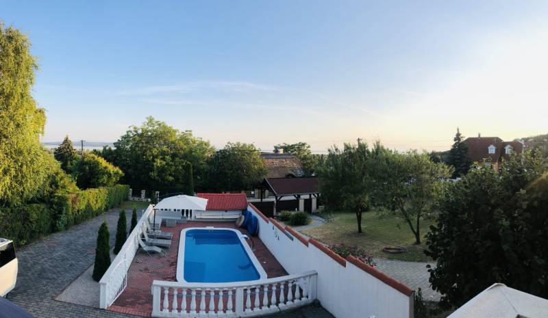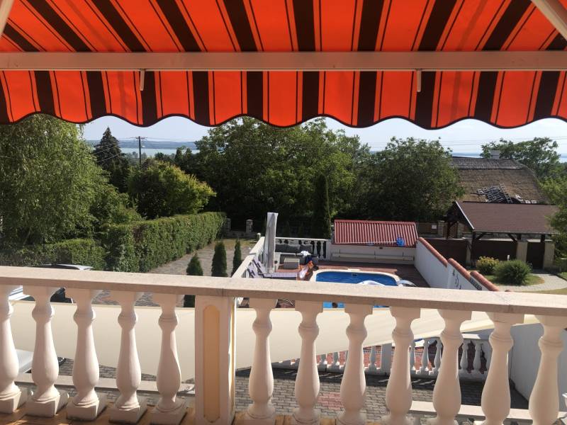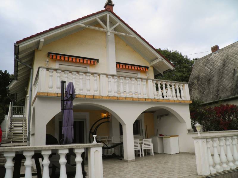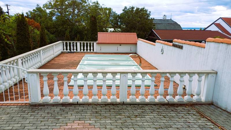 A BALATON ÉSZAKI PARTJÁN, VONYARCVASHEGYEN CSENDES KÖRNYÉKEN, NYUGODT KÖRNYEZETBEN ELADÓ PANORÁMÁS, TÖBB FUNKCIÓS CSALÁDI HÁZ ÚSZÓMEDENCÉVEL. AZ OTTHON CENTRUM KIEMELT AJÁNLATA.Az ingatlant biztonságos, kedvelt kicsi zsákutcában találjuk. Pontosan illik rá a település szlogenje: \" Mögöttünk az erdő, előttünk a víz.\" A telek 714 m2, nagyrész térkövezett, könnyen karbantartható. A ház két szintes, hatalmas terasszal, erkéllyel, ahonnan a Balaton tükrében is gyönyörködhetünk. Megbízható minőségben épült 2003-ban, néhány éve modernizálták, alakítottak a használati beosztáson.További jellemzői: - Összközműves tégla épület, cserép fedéssel. Műanyag nyílászárók. - Gáz cirkó fűtés, + két hangulatos kandalló -4 hálószoba, 3 fürdőszoba nagyobb családnak is kényelmes elhelyezést biztosít. - A nettó lakótér 120 m2, ami nem foglalja magában a teraszokat, erkélyt, tárolókat. - Helyiségek: A földszinten teraszkapcsolatos nappali, egy légterű, de szaperált modern konyhával, étkezővel. Kis közlekedőből nyílik egy fürdő, tágas hálószoba és a lépcsőfeljáró. A felső szintre belül, és külső lépcsön is fel lehet jutni. Itt három hálószobát, zuhanyzós és kádas fürdőszobaát alakítottak ki. A déli tájolású legnagyobb hálóból panoráma erkély nyílik. ( Az alaprajzon a mgnevezésekben látozás történt)A ház mögött két méretes tároló, elektromos távirányítós záróredőnyokkel. Elektromosan vezérelt kapu. Mivel a két szint külön bejárattal is rendelkezik, két generáció lakhatására, nyaralására, kiadásra is alkalmassá tehetó. Befektetésnek szintén kiváló ajánlat.A ház teljes berendezéssel. felszereléssel kerül értékesítésre, amit a vételár tartalmaz. Vonyarcvashegyet a Keszthelyi-hegység öleli körül, erdőivel, szőlőültetvényeivel, árnyas pincéivel, benne sajátos ízvilágú boraival. Ötcsillagos Lido strandja számos alkalommal érte el a Balaton legszebb, legsportosabb strandja kitüntető elismerést. A környék jellegzetessége a Csándor-hegy tetején álló Kálvária út és a végén a 2010-ben felszentelt 7,38 méter magas Fénykereszt. A Balatonból kiemelkedő egykori dombsziget, a 136 méter magas Szent Mihály domb. Tetején áll a 40 jéghalász megmenekülése emlékét őrző Szent Mihály Fogadalmi Halászkápolna, mely Magyarország, sőt a tengerparttal nem rendelkező országok egyetlen Halászkápolnája. Ez a csodás fekvésű, romantikus hangulatú szakrális hely megigézi az idelátogatókat. A hosszú évszázadok múltját őrző kápolna Vonyarcvashegy jelképévé vált.Ha felkeltette érdeklődését a fenti ingatlan, további kérdései vannak, megtekintéshez időpontot egyeztetne, kérem, hívjon, írjon a megadott elérhetőségeken.