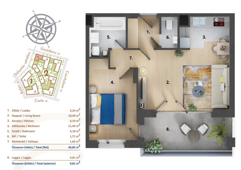 A XIII. kerület legnépszerűbb lakónegyedében, a Marina parton, a Duna Terasz Grande második épületében keresi új tulajdonosát egy amerikai konyhás nappali + hálószobás, 9,81 m2-es loggia-val rendelkező napfényes lakás! Ha érdekes lehet Önnek a Foka öböl közelében található, a modern életstílust az otthonos, családias hangulattal ötvöző ingatlan, akár befektetési célból akár saját célra, akkor ezt feltétlenül nézze meg!MIÉRT IDEÁLIS A LAKÁS?- 1. emeleti, 44,85 m2-es, 2 szobás, 9,81 m2-es loggia-val rendelkező ingatlan.- Felosztása: előtér, amerikai konyhás nappali és étkező, hálószoba, fürdőszoba, WC, erkély.- Kialakítása modern, elosztása logikus, a szobák tájolása nyugati.- A nappaliból és a hálószobából is van kijárat a nagy sarok erkélyre.- Magas minőségű és esztétikus anyagokkal, igényes burkolatokkal, prémium Laufen szaniterekkel, Hansgrohe csaptelepekkel készült.- A szobákat és az előteret laminált padlóval a fürdőszobát járólappal burkolták.- Nyílászáról műanyagok, ablakai hő és hangszigetelt 3 rétegű üveggel szereltek, az élettér világos.- Hőszivattyú által működtetett hálózat biztosítja, hogy a mennyezeti hűtés-fűtés, a legkevesebb energiafelhasználással az optimális hőfokot érje el.- Energetikai besorolása A++- A lakás egyedi hőmennyiség mérővel, vízórával, illetve elektromos mérőórával felszerelt.- A tervezett fűtési és hűtési költség (45 m2-es lakás esetén) kb. 10.000,-Ft/hó.- A lakásban okosotthon rendszer, videós kaputelefon és elektromos redőny előkészítés is van.- Az ingatlan könnyen kiadható, átlagosnál magasabb megtérülést biztosíthat.- A lakáshoz + 8,5 millió Ft-ért vásárolható egy normál méretű teremgarázs beálló hely.- A vételár tartalmazza az egyedileg készített konyhabútort háztartási gépekkel felszerelve, illetve a LED-es lámpatesteket minden helyiségben.AMIT A HÁZRÓL TUDNI KELL:- 2024-ben átadott, 5-9 szintes, 790 lakásos, tudatosan tervezett, letisztult épület.- A lakópark a modern városi élethez igazodó építészeti stílust képviselve kínál magas minőséget.- A társasház vasbeton monolit szerkezetű, 30 cm-es Porotherm téglából álló külső kitöltő falakkal és 15 cm-es dryvit szigeteléssel.- A lakásokat 30 cm-es Szilka tégla fal választja el.- A homlokzat és a lépcsőház modern vonalvezetésű, igényes megjelenésű.- A pinceszinten és a földszinten teremgarázs beállók és tárolók, valami modern liftek biztosítják a lakók kényelmét.- Műszaki tartalma magas minőségű, innovatív megoldásokkal és zöld energia felhasználással készült.- A társasház belső részén több kisebb parkosított, zöld belső kert került kialakításra.- A társasházban 0-24 Portaszolgálat és csomagpont is működik.KÖRNYÉK ÉS KÖZLEKEDÉS:- XIII. kerület, Vizafogó városrész, Marina part, Úszódaru utca.- Kiváló infrastruktúrával és tömegközlekedéssel rendelkező, folyamatosan fejlődő terület, természetközeli környezet.- A Gyöngyös utcai M3-as metrómegálló és a Duna Plaza, 5 perc sétatávolságra van.- A 15-ös busz megállója 50 m távolságra van, a 950-es és a 950A éjszakai buszjáratok 20 percenként közlekednek.- 500 méteren belül gyalogosan elérhető minden, ami a hétköznapokhoz szükséges.- Karnyújtásnyira van gyógyszertár, orvosi rendelő, edzőtermek, mozi, éttermek és szolgáltatók sokszínű választéka.- A lakóparkban közös jóga, napozó és grillterasz, játszótér, kültéri edzőterem lett kialakítva.- A közelben van hajókikötő, Duna parti sétány, kerékpárút, a Dagály fürdő, és az Aréna uszoda.- A nagyobb budapesti egyetemek tömegközlekedéssel maximum 15 perc alatt elérhetők.- Az autóval közlekedők a Váci úton érhetik el Buda és Pest főbb csomópontjait, valamint az M0-ás és M2-es autópályákat.- A környék kifejezetten vonzó a fiatalok és a kozmopolita életet kedvelők számára.FINANSZÍROZÁSBAN – ONLINE IS – SEGÍTÜNK!- Bankfüggetlen hitelcenterünk díjmentesen versenyezteti az összes bank és hitelintézet ajánlatát.- Önnek csak annyi a dolga, hogy egyeztet munkatársunkkal, majd kiválasztja a hosszú távon is legkedvezőbb konstrukciót.- Szakértőink 20 év tapasztalattal, fogyasztóbarát lakáshitelekkel, babaváró hitellel és teljes körű CSOK Plusz és OTTHON START program ügyintézéssel várják.- Időpont-egyeztetéssel munkaidő után is elérhetők.Ha valóban igényes és minőségi felújításon átesett, különleges lakást keres, jöjjön és nézzük meg együtt! EGYEDI LEHETŐSÉG, ne maradjon le róla!Érdeklődés esetén VÁROM HÍVÁSÁT a hét minden napján!