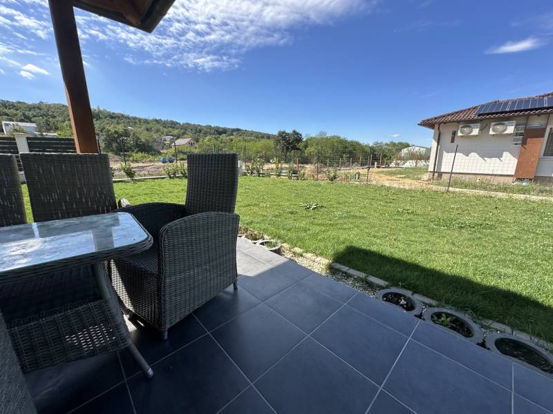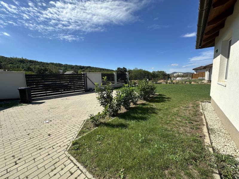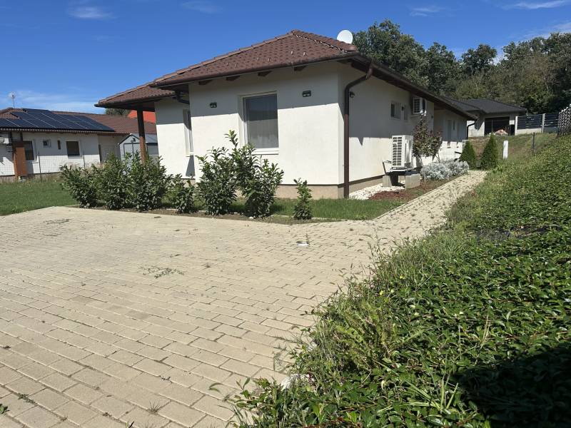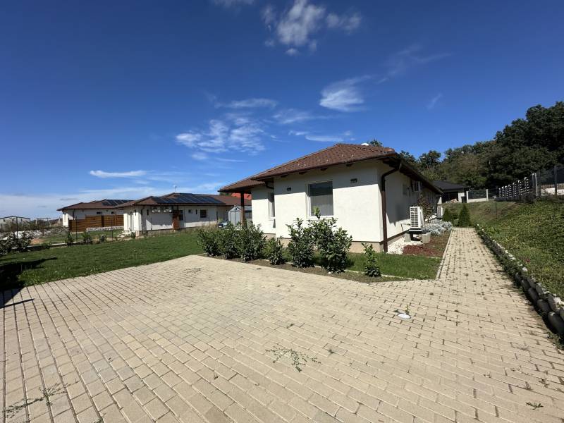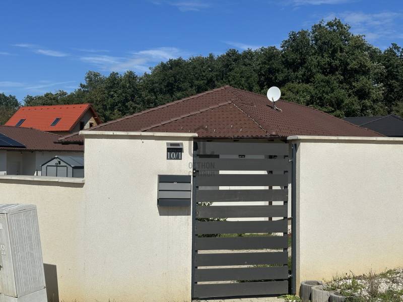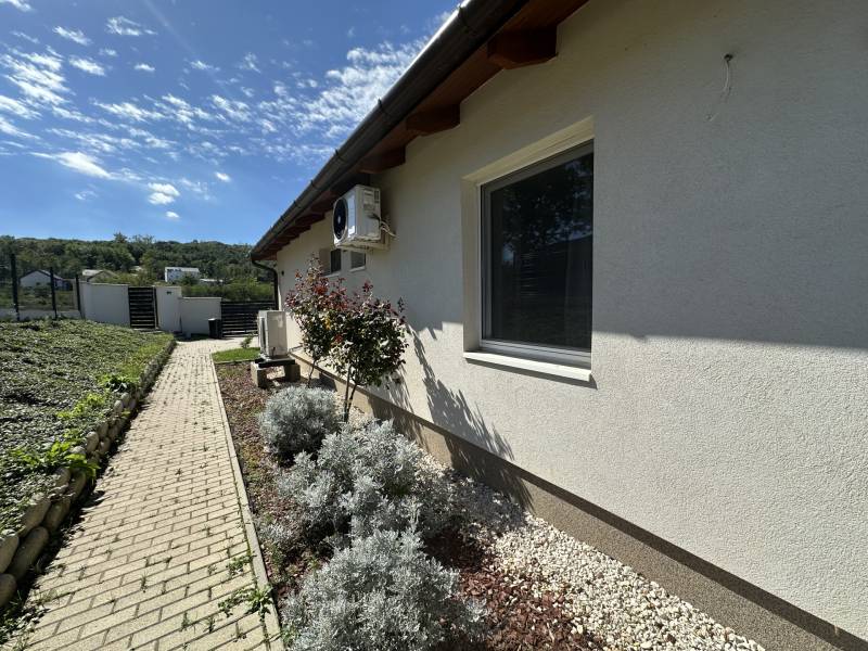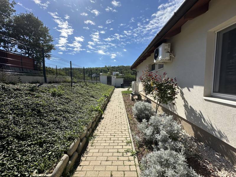 Pilisjászfalu , Somlyó-völgy területén parkosított kertben igényes, sarok telken ikerház rész eladó.PILISJÁSZFALU belterületén, csendes, erdős részen, a Somlyóvölgyi lakóparkban megfizethető, földszintes, 70 nm-es ikerház rész eladó.A ikerház rész ( társasházi lakás) 70 nm-es, saját 400 nm saját telekkel, amerikai-konyhás nappalival, három hálószobával, fürdőszobával, külön WC- kézmosóval, közlekedő lett tervezve és kivitelezve- 2021-ben került átadásra- A teljes telek nagysága 990 nm ebből egy 400 nm önálló rész tartozik a társasházi lakáshoz.- A lakás ( ikerház rész ) teljesen önálló HRSZ számmal rendelkezik.- Kert kialakítva, rendezett, füvesített, öntözőberendezés, dísznövényekkel beültetve- A telek teljesen bekerítve, beton alappal, támfalakkal.- Összközműves- Fűtés nappaliban, fürdőszobában, közlekedőben padlófűtés , a szobákban radiátor- Hőszivattyú adja a melegvizet és a fűtést. ( BOSCH típusú hőszivattyú) - Átlagos rezsi költség alacsony- Fedett terasz- Burkolat a 15nm-es teraszon kültéri fagyálló lap- A lakásokon belül a burkolat a szobákban laminált lap, a többi helyiségben járólap- Hűtő- fűtő klíma beépítve 3,5 KW- Műanyag nyílászárók, minden ablakon szúnyogháló és redőny- Elektromos kapu- autóbeálló díszburkolattal burkolva- kerti csap- padlásfeljáró, tárolásra kialakítható padlás- a fedett teraszra a nappalin juthatunk ki - konyhabútor egyedi tervezéssel készült,- konyhában minőségi műszaki berendezés- egy hálószoba valamint két külön álló lakószoba lett kialakítva- Birtokba adás 1 hónap - Az épület sáv alapozással épül, 30-as N+F kerámia falazó blokkból készült.- 14 cm-es hőszigetelő vakolati rendszerrel kiegészítve, fehér színű dörzsölt nemes vakolattal- Válaszfalak 10-es tégla- Tetőfedés \"TERRAN\" cserépfedés- Víz-hang és hőszigetelés a megfelelő vastagságban.- Külső nyílászárók háromrétegű üvegezéssel, hőhíd-mentes műanyag.- hangszigetelt fal választja el a két lakást egymástól- teraszajtó középen felnyíló négy osztású-bejárati ajtó acélszerkezetes biztonsági- Elektromosság 1 x 32 A, új villanyórával