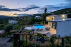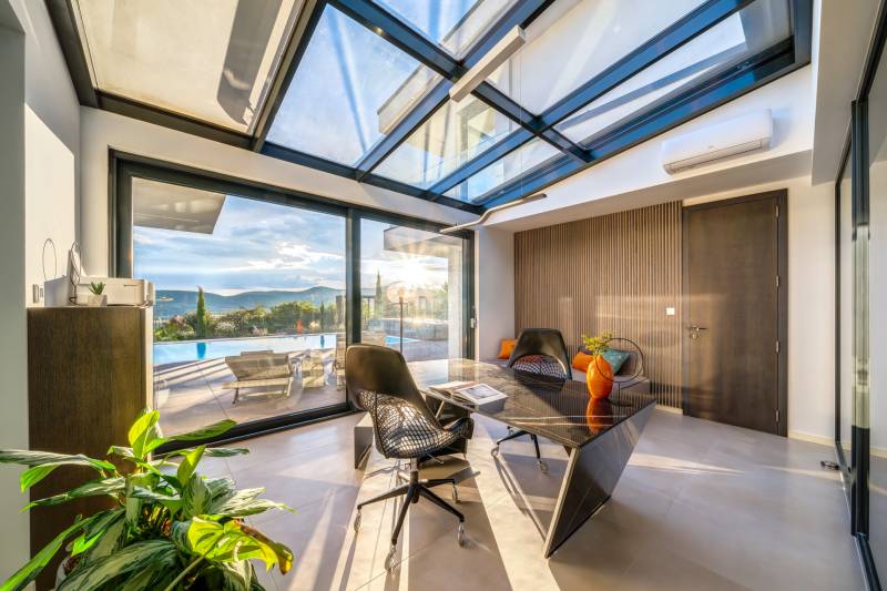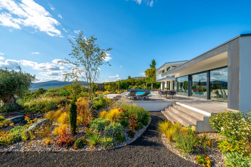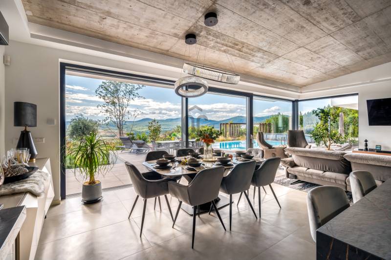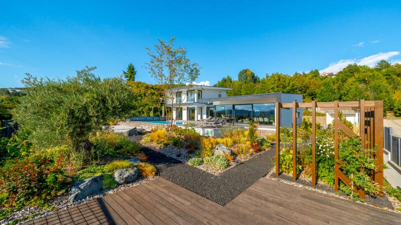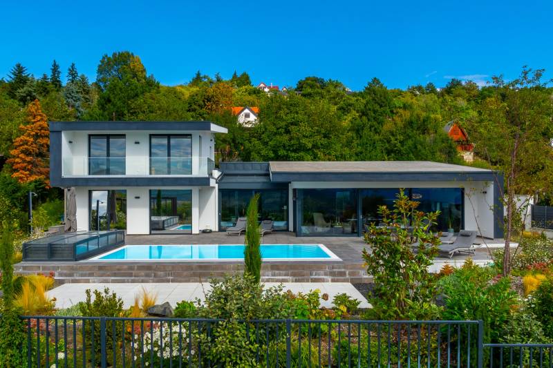 Egy hely, mely inspirál, energetizál, ahol önmagad lehetsz. Ebben a környezetben nincs legyőzhetetlen akadály. Üdv itthon! RÖVID ÖSSZEFOGLALÓSzentendrén, Szarvahegyen, a panorámás Tambura utcában – eladó ez a 278 m²-es, kétszintes, négy hálószobás, három fürdőszobás modern családi ház.A tágas terek, a medence, a kétállásos garázs, a hőszivattyús padlófűtés és mennyezethűtés, valamint a dél–nyugati fekvésű, zavartalan kilátás mind azt szolgálják, hogy itt a mindennapok álomszerűek lehessenek.Egy ház, ahol a fény mozdulatot formál, és a tér minden napszakban más arcát mutatja.Szentendre – és benne SzarvashegySzentendre sosem csupán város, inkább egy finoman pulzáló önálló világ melynek egyedi miliője semmihez sem hasonlítható. Kicsit olaszos, kicsit mediterrán - macskaköves utcái által mesebeli világba csöppen az ember és szinte észrevétlenül lelassítja lépteit.Szarvashegy az egyik legnemesebb pontja: levegője tiszta, a fák között átszűrődő fény pedig minden órában más hangulatot ad a tájnak. Innen a város látványa festményszerű – a házak teteje, a Duna kékje, a Pilis sziluettje együtt rajzolja ki azt a képet, amit naponta látva sem lehet megunni.A Tambura utca a domboldal csendes, zöld szeglete, ahol a naplemente a hegyek mögül lép elő, és estére borostyánfénybe burkolja a kertet. A környék ideális családoknak: iskola, óvoda, helyi bolt, pékség és sportpályák néhány percre, a belváros pedig tíz perc alatt elérhető.Aki Szarvashegyen él, tudja, hogy innen minden elérhető – csak épp nem kell rohanni érte.Egy vasárnap reggel a Pékműhely kovászos kenyereivel, délután séta a Bükkös-patak partján, este egy csendes borozás a teraszon — ezek nem programok, hanem ritmusok, amik idővel az élet részévé válnak.Kívül – a táj részekéntA Tambura utcai ház a domboldal természetes vonalait követi – nem uralja, inkább kiegészíti a tájat. A letisztult, modern forma, a beton és üveg finom játéka tökéletes ritmust talál a körülötte lélegző zölddel.A homlokzat kétszintes arányai határozottak, de nem szigorúak; a horizontális vonalak és a nagy üvegfelületek között megmarad az egyensúly, amelytől a ház – bár kortárs – mégis meleg és élhető.A kert lépésről lépésre tárul fel, mintha egy gondosan komponált sétaút lenne. Az illatos növények és örökzöldek keverednek az évelő virágokkal, majd a tekintet lassan a medence irányába vezet. A víztükör szinte egybeolvad a látóhatárral – az ég és a táj közötti határ elmosódik.A növényzet nem díszlet: levendula, olajfa, díszfüvek és kőágyások teremtik meg azt a mediterrán hangulatot, amely nyáron élettel tölti meg a kertet, télen pedig elegánsan visszafogott marad.A terasz tágas, természetes kőburkolata a medencével együtt a ház szíve. Itt minden a kilátásra épül – a Pilis lágy ívei, a Duna csillanása és Szentendre fényei alkotják azt a látványt, amely nemcsak díszlet, hanem a mindennapi élet része.Ahogy a nap lemegy, a medence fénye lassan átveszi a természet szerepét: a víz kékje dereng, a ház üvegfelületein megcsillan az esti fény, és a kert halk esti zsongásában az ember szinte észrevétlenül lelassul.Belül – tér, fény, ritmusAhogy belépünk, az első érzés a tágasság. A nagy üvegfelületeken át a tekintet szinte azonnal a kertbe fut, mintha a külső tér folytatódna a nappaliban. A beton mennyezet karaktere határozottságot ad, míg a meleg árnyalatú padló és a bársonyosan puha textíliák lágyítják a struktúrát – a ház egyszerre hűvös és otthonos, mint egy mély levegővétel a nyári délutánban.A nappali–étkező–konyha egyetlen folytonos tér, ahol a fény a legfontosabb szereplő. Reggel finoman áttör a függönyökön, délután táncol a márványfelületeken, estére pedig aranyló derűt von a bútorokra. A konyha központi eleme a természetes kősziget, amely egyszerre funkcionális és látványelem – itt zajlik a mindennapi élet, mégis marad benne valami ünnepélyes.A lépcső, amellyel az emeletre érkezünk, szinte szoborszerű. A lebegő hatású, fényekkel kísért fokok nemcsak közlekedést szolgálnak, hanem finom ritmust adnak a belső térnek – ahogy lépsz, a ház is mozdul veled.A hálószobák már más hangon szólnak. A főhálóban a mennyezeti ablakon át a nap első fényei puhán szűrődnek be, a falakon természetes tónusok, a textúrák között sötét fa és puha szövet váltakozik. Itt minden a pihenésről szól: a csendről, ami nem üresség, hanem jelenlét.A fürdőszobák az anyagok harmóniájára építenek: kő, üveg és fény dolgozik együtt, hogy a napi rutinból rítus legyen. Minden részlet átgondolt – a burkolatok mintája, a rejtett világítás, a terek aránya mind azt a gondoskodást tükrözik, amely ezt a házat áthatja.Ebben az otthonban nincs semmi véletlen. Minden vonal a kilátásra, minden ablak a fényre, minden anyag az időre van hangolva.A külső és belső terek között nincsen határ – inkább egyfajta lassú átmenet, mint amikor a naplemente színei fokozatosan olvadnak át az esti fénybe.Ez a ház nem egyszerűen épült – komponálták.Amennyiben szeretné személyesen is megtapasztalni ennek az otthonnak egyedülálló atmoszféráját, várom megkeresését.