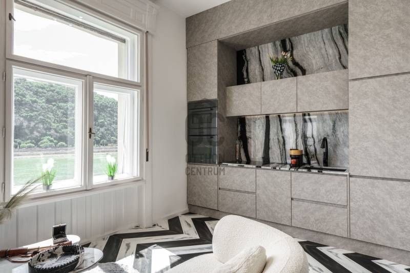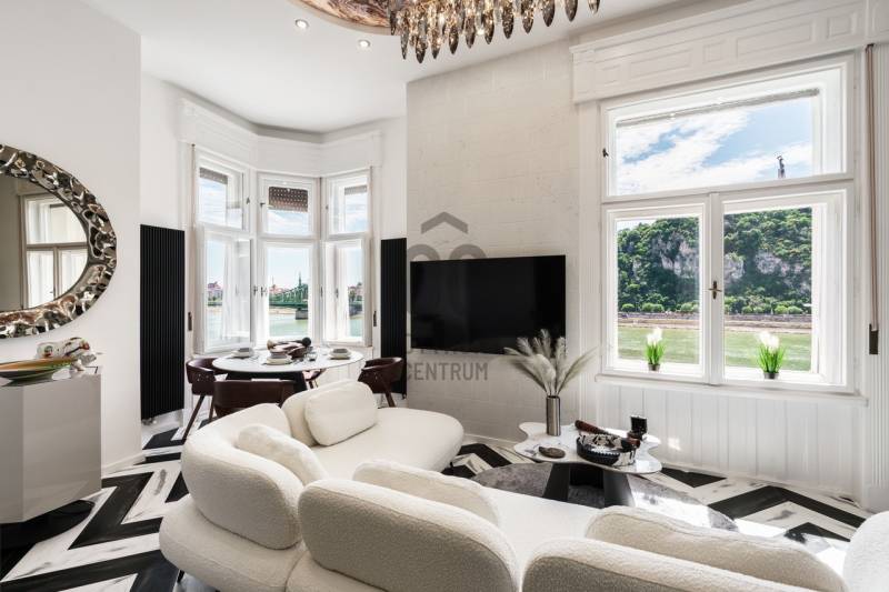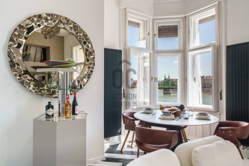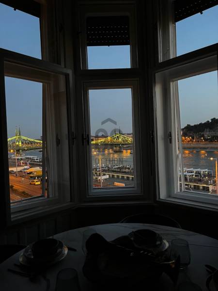 Ha egyedi otthonra vágyik! Olyanra ami senki másnak sincs!Budapest egyik legértékesebb területén a Belgrád rakparton eladó Szabadság hídra panorámás ,felső emeleti luxus otthon . A DNY-i fekvésű lakás egy rendezett, zárt lépcsőházas ,liftes társasház III.emeletén helyezkedik el. A szinten csak 4 lakás található! A lakás 2éve teljeskörű felújításon esett át! A sarok lakás mindhárom szobája utcára néz. A nappali két ablakából és az egyik hálószobából is fantasztikus Dunára és Szabadság hídra néző panoráma tárul elénk. A nagyobbik hálószoba pedig csendes mellékutcára néz. A lakás teljes bútorzattal együtt eladó amely a vételár részét képezi. Az alábbi anyagok felhasználásával történt a felújítás:Mardegan olasz tölgy parkettaMiele konyhagépekAristone kézmosóvalódi dió falburkolatFlorim és Porcelanosa csempékegyedi beltéri ajtókOnyx burkolatRoche Bobis ágy és bárfólia mennyezetekdesign francia Trone Wc-kEgyedi lehetőség! Éljen vele!